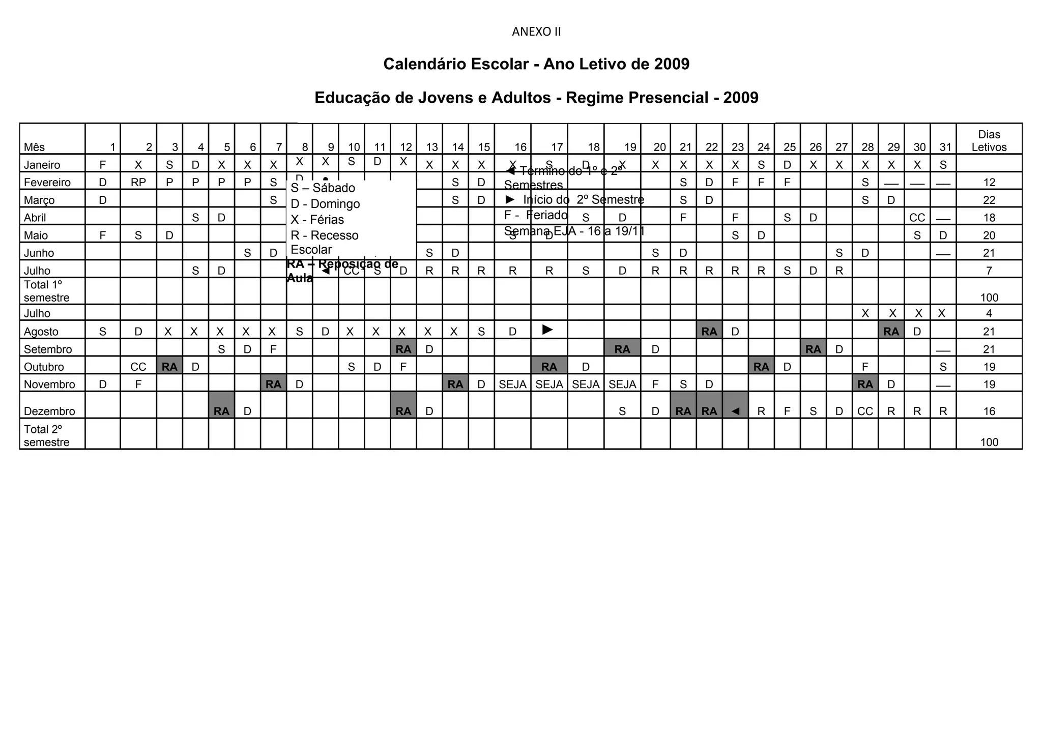 O documento apresenta o calendário escolar para o ano letivo de 2009 da Educação de Jovens e Adultos no regime presencial. O calendário contém os meses de janeiro a dezembro, com a indicação dos dias letivos, feriados, férias, recessos e datas importantes. O ano letivo é dividido em dois semestres, com 100 dias letivos cada.