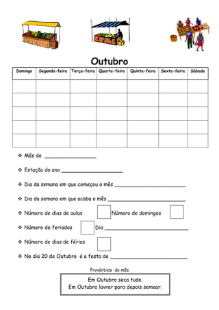 Este documento fornece informações sobre os meses do ano, incluindo o nome do mês, estação do ano, dias da semana em que começa e termina o mês, feriados e provérbios associados a cada mês.