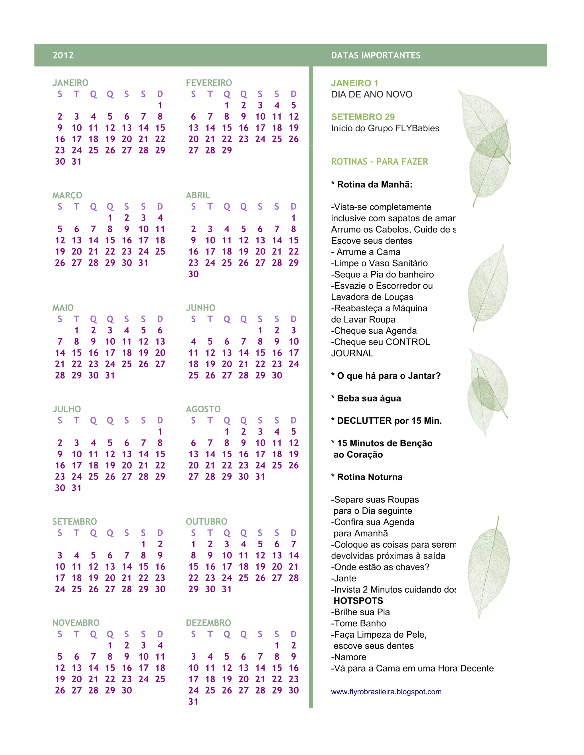 Este documento fornece um calendário de datas importantes para 2012 e rotinas diárias recomendadas para organizar a casa e a vida, incluindo arrumar a cama, lavar louça, verificar agenda, beber água, declutter por 15 minutos, benção ao coração, separar roupas, jantar, cuidar da pia e dormir em hora decente.