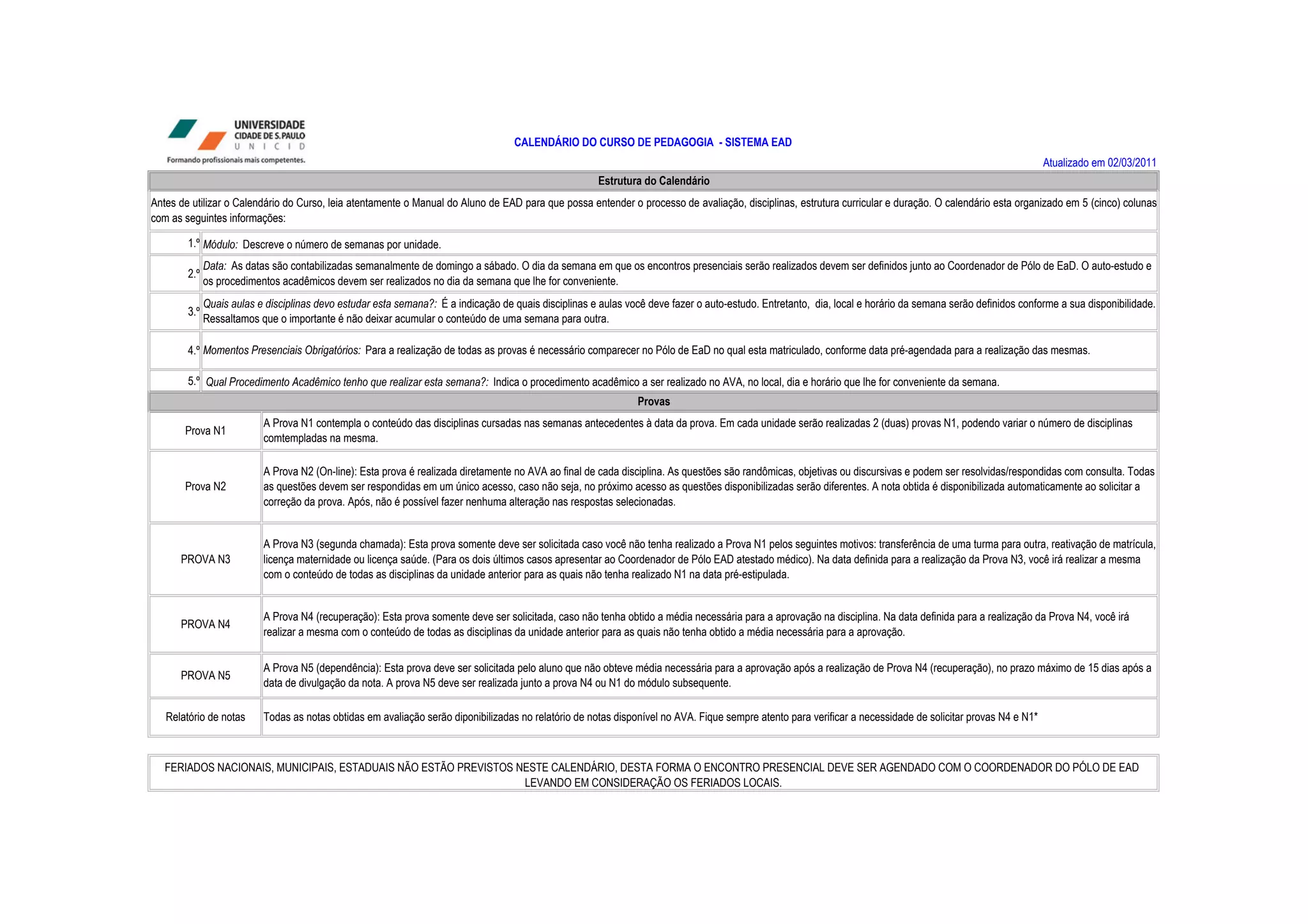 1) O documento apresenta o calendário de um curso de pedagogia na modalidade EAD, com informações sobre disciplinas, datas de provas e procedimentos acadêmicos a serem realizados ao longo do curso.
