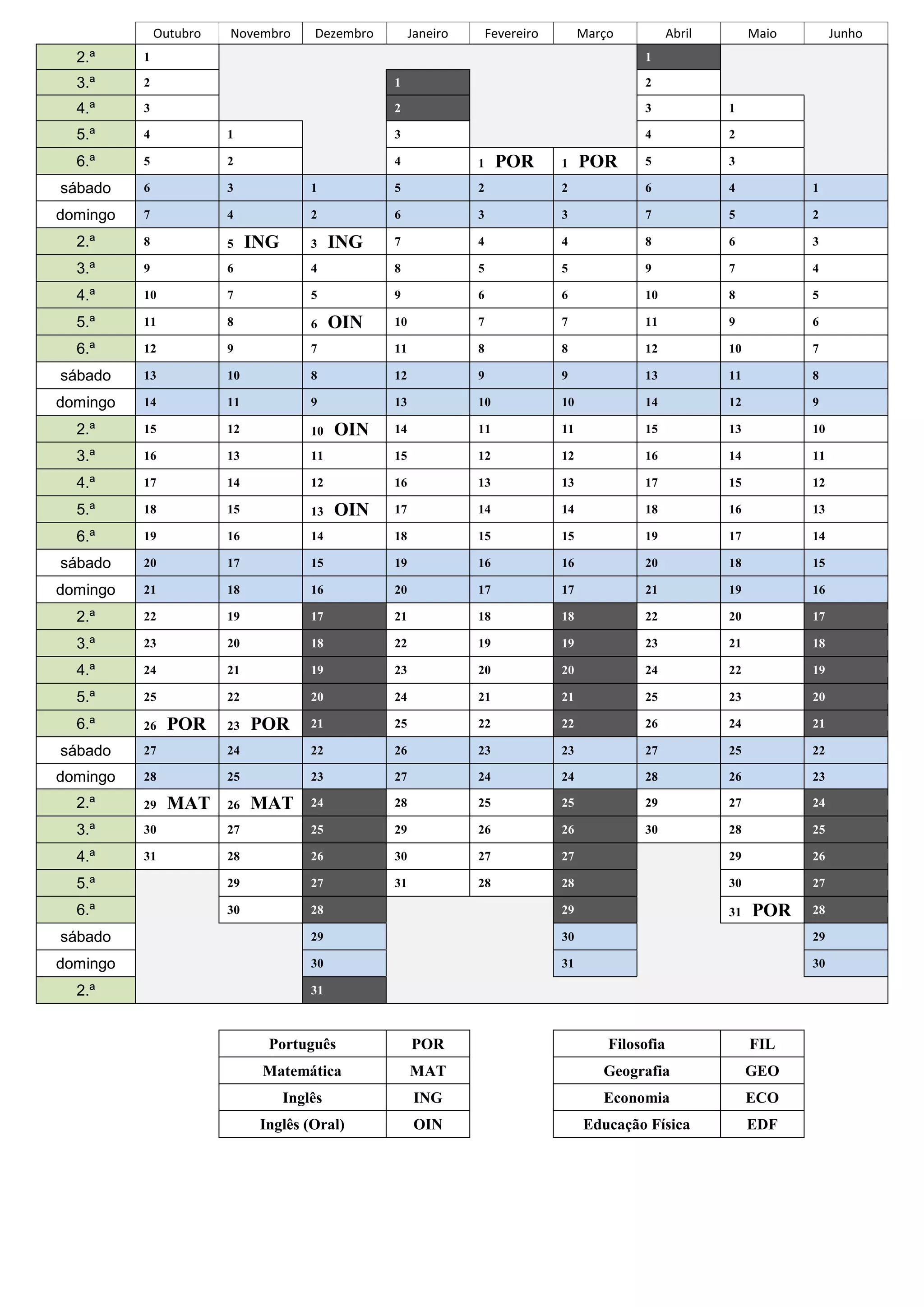 1) O documento apresenta uma tabela com as aulas de diferentes disciplinas em cada dia da semana para os meses de outubro a junho.