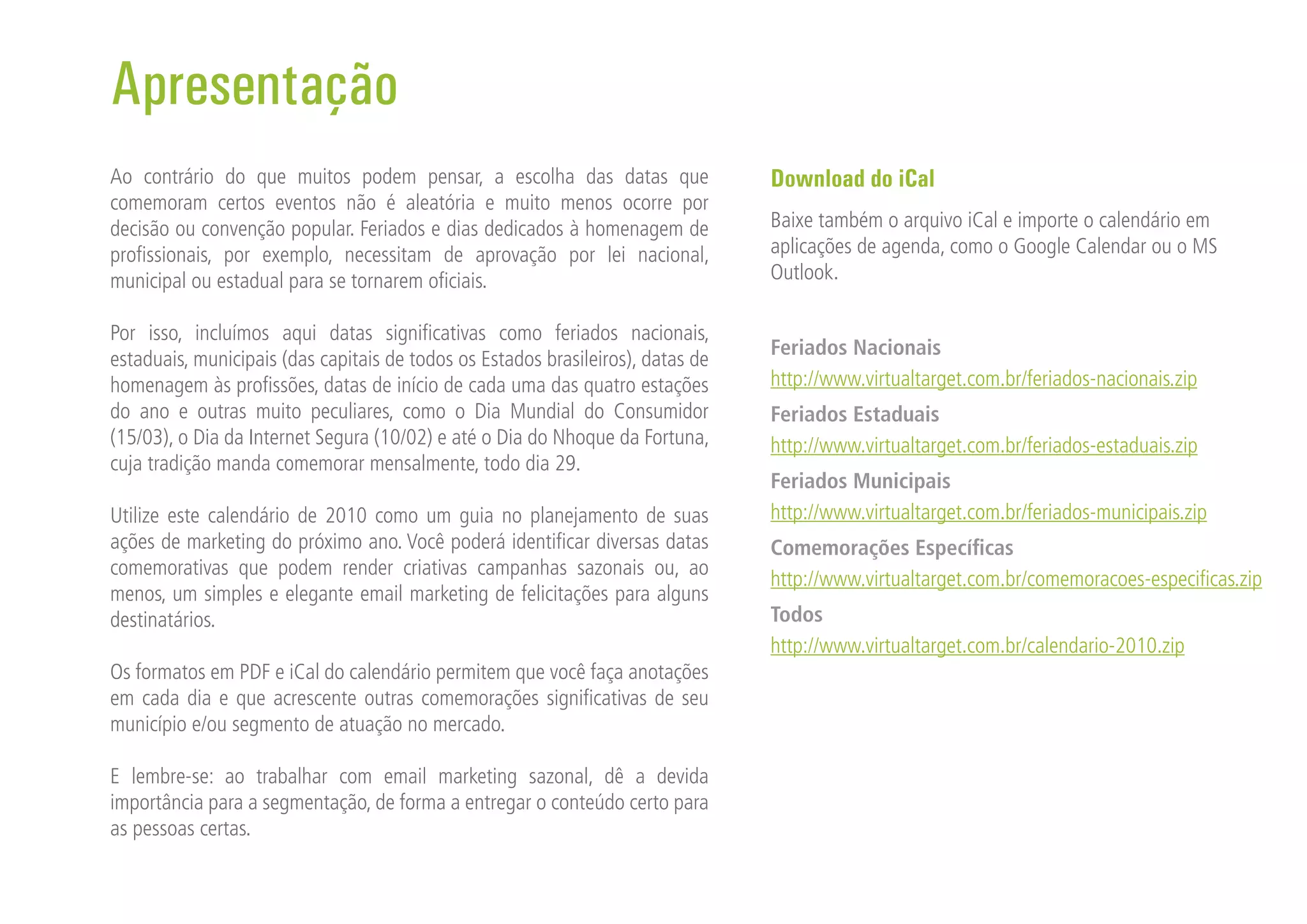 2) O objetivo é fornecer um guia para planejamento de ações de marketing, identificando datas que podem ser aproveitadas para campanhas sazonais ou emails de felicitações.