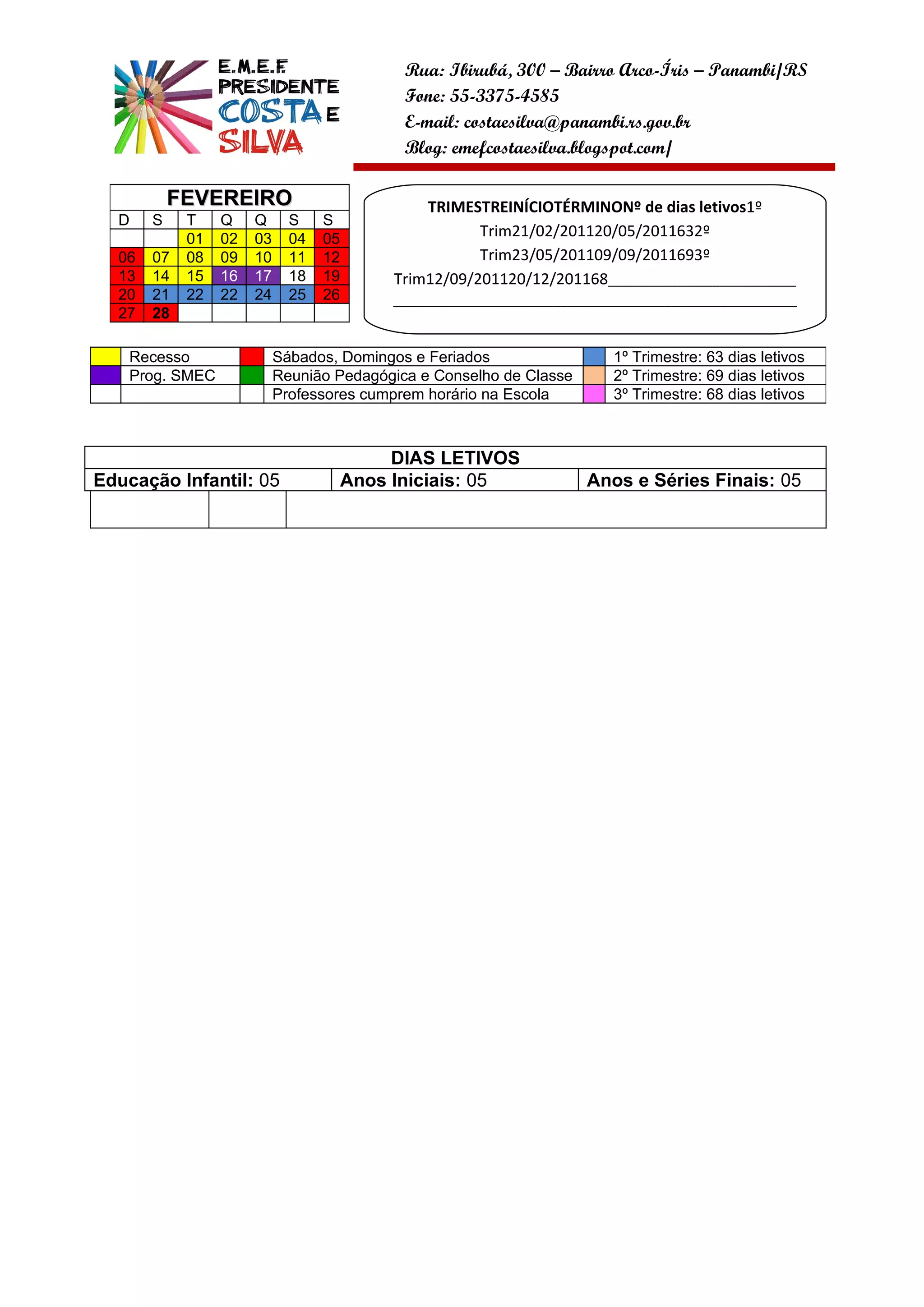 O documento apresenta o calendário escolar da Escola Municipal de Ensino Fundamental Costa e Silva, localizada em Panambi/RS, com as seguintes informações essenciais: o período letivo de cada trimestre, as datas das reuniões pedagógicas, conselhos de classe e encontros com pais e parceiros, além do número de dias letivos para cada etapa de ensino.