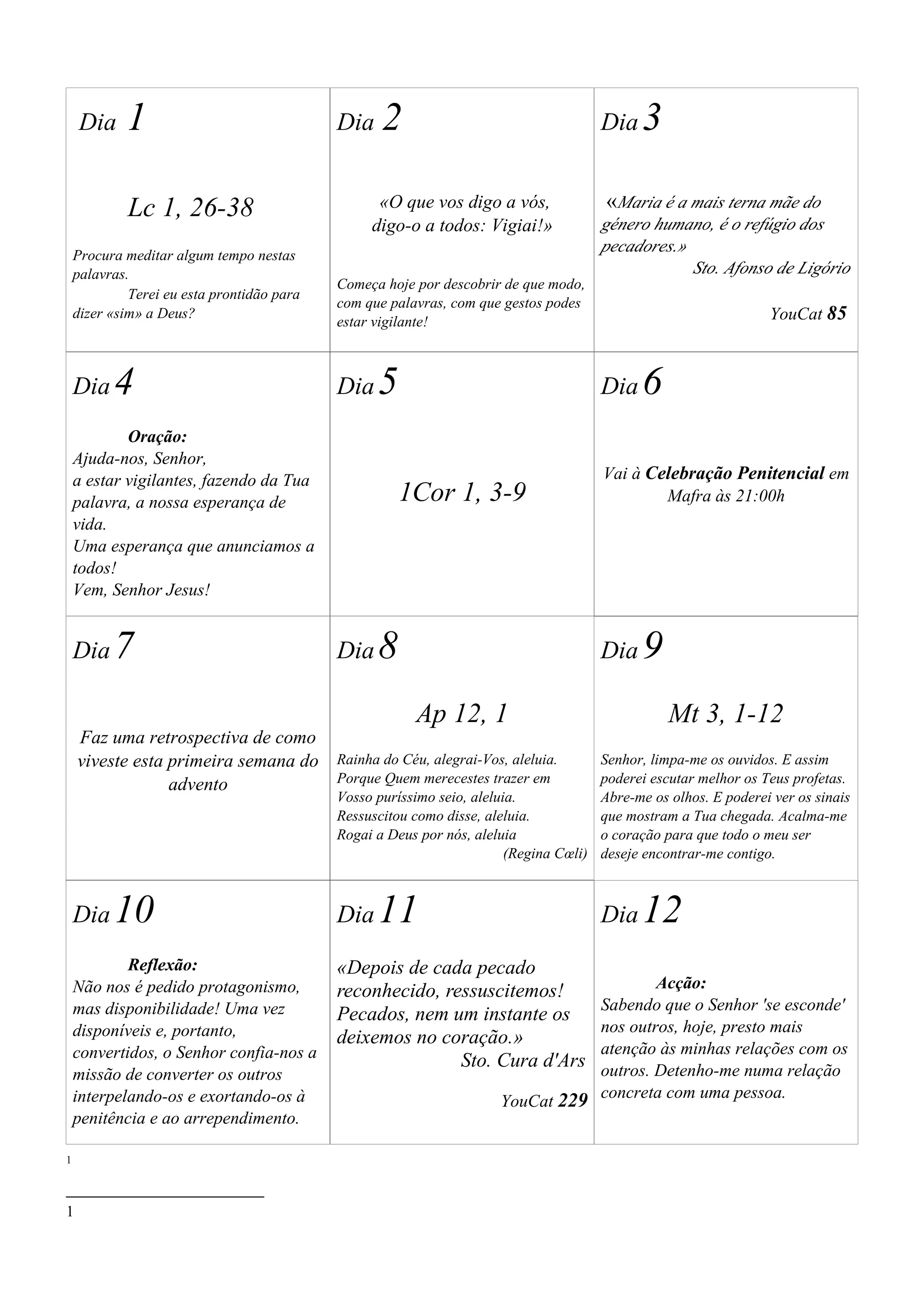 Este documento apresenta um guia de oração e reflexão para os dias do Advento, com citações bíblicas, orações, ações sugeridas e reflexões para cada dia, visando preparar o espírito para a celebração do nascimento de Jesus.