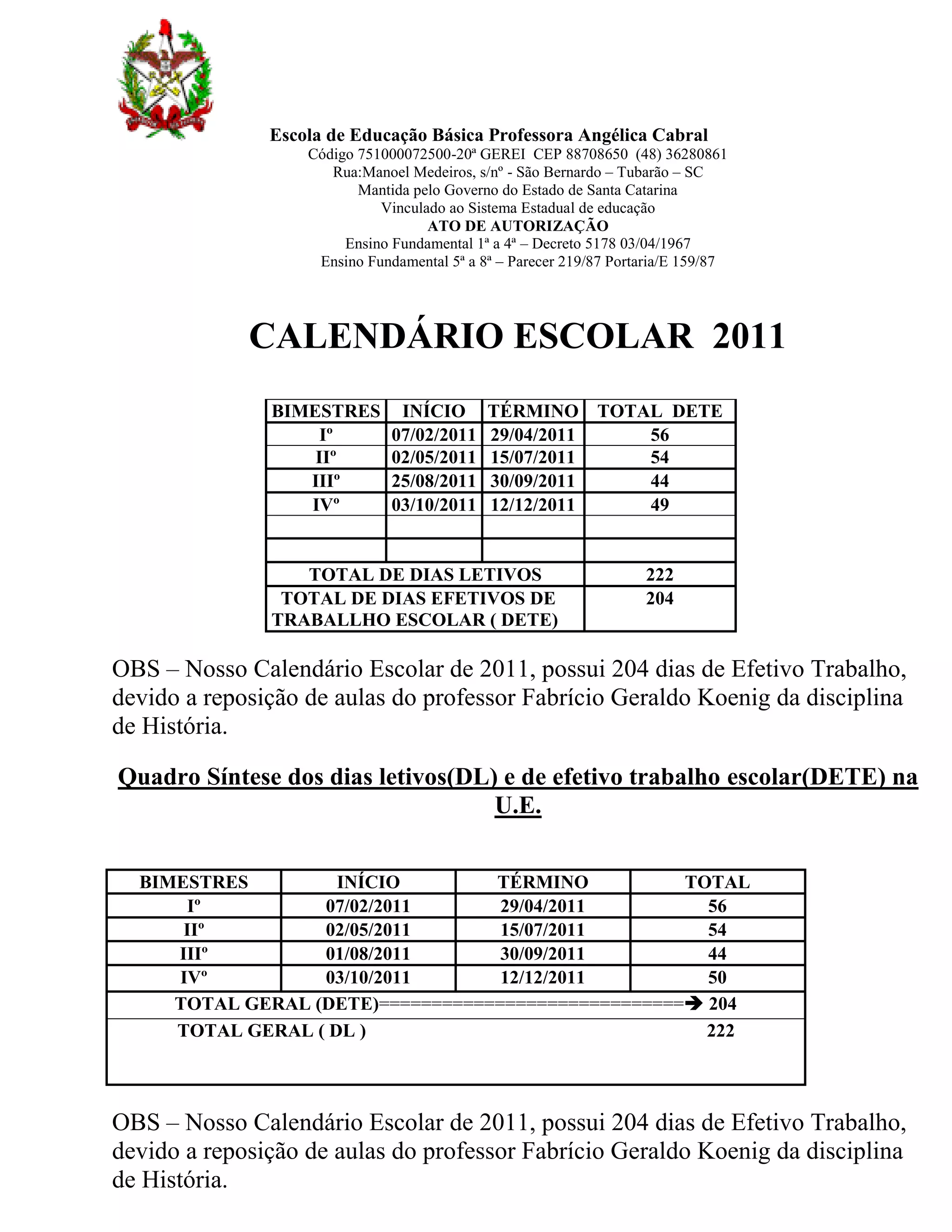 O documento apresenta o calendário escolar da Escola de Educação Básica Professora Angélica Cabral para o ano de 2011, com 204 dias letivos devido a reposições de aulas do professor de história. Ele detalha as datas de início e término de cada bimestre, feriados, recessos, atividades e reposições de aulas ao longo do ano.