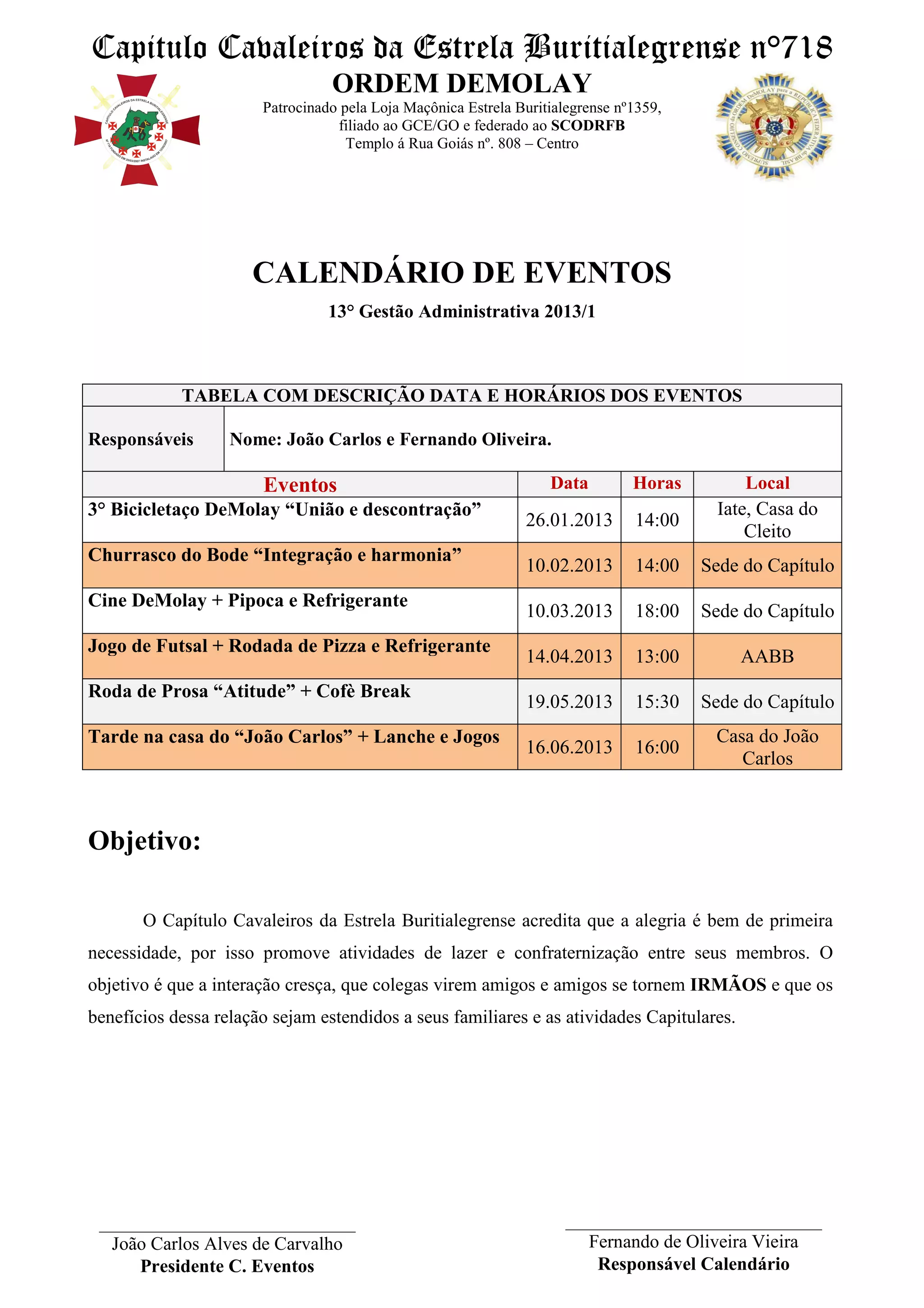 O documento apresenta o calendário de eventos do Capítulo Cavaleiros da Estrela Buritialegrense para 2013, com datas e horários de atividades como bicicletaço, churrasco, cinema, futebol e encontros. O objetivo é promover a integração e amizade entre os membros por meio da interação e lazer.