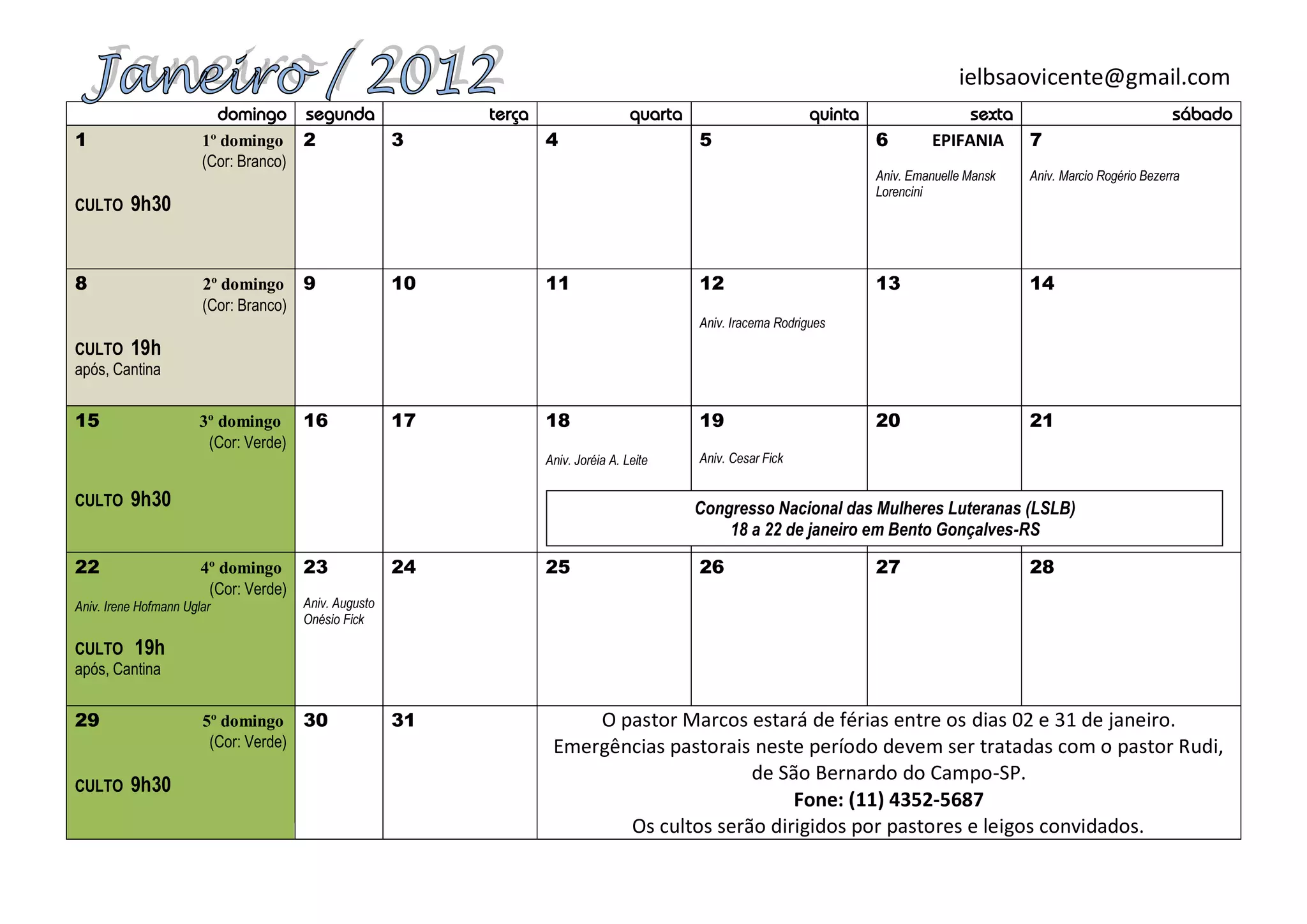 Este documento apresenta o calendário de eventos de uma igreja para o mês de janeiro. Ele inclui datas de aniversários, cultos com horários e cores litúrgicas, e informa que o pastor Marcos estará de férias entre os dias 2 e 31 de janeiro, fornecendo contato para emergências pastorais.