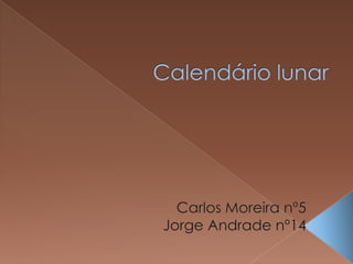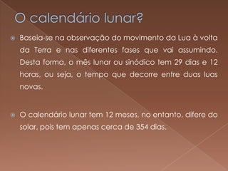 O documento descreve o calendário lunar, que se baseia no ciclo das fases da Lua e dura aproximadamente 29 dias e 12 horas. Ele também explica que o calendário lunar romano original tinha 10 meses e 304 dias, mas foi reformado para ter 355 dias divididos em 12 meses.