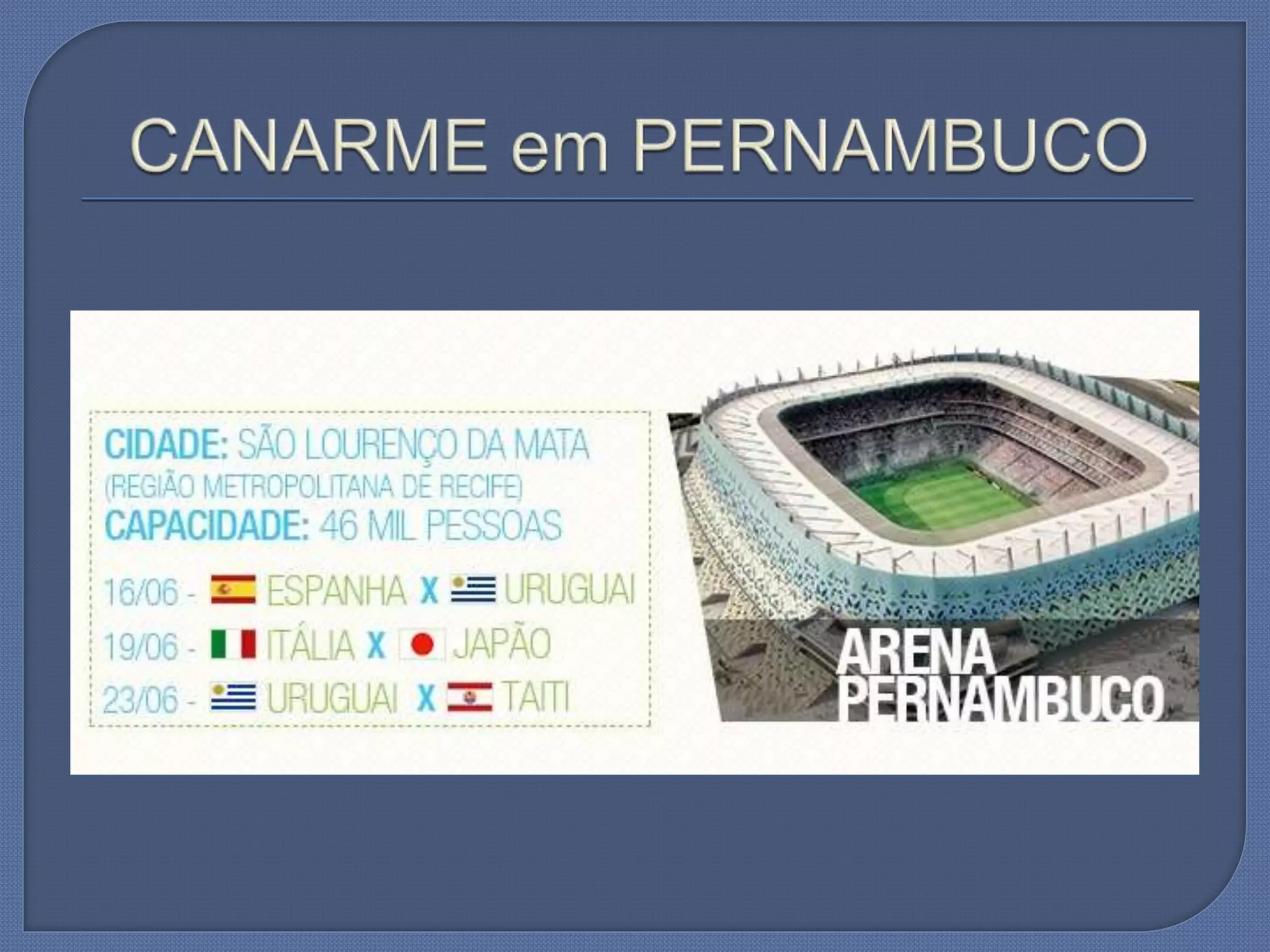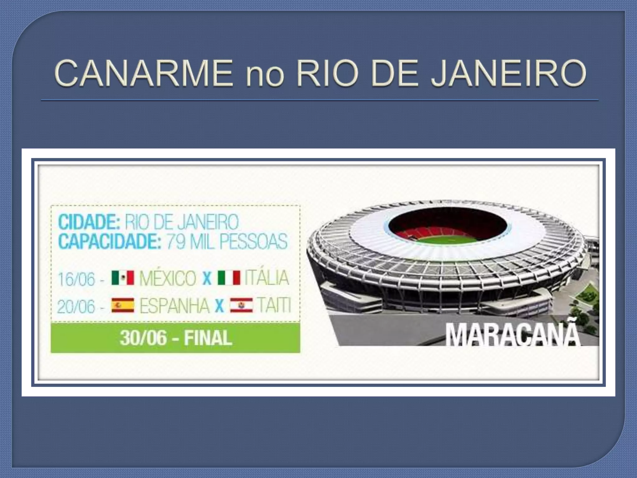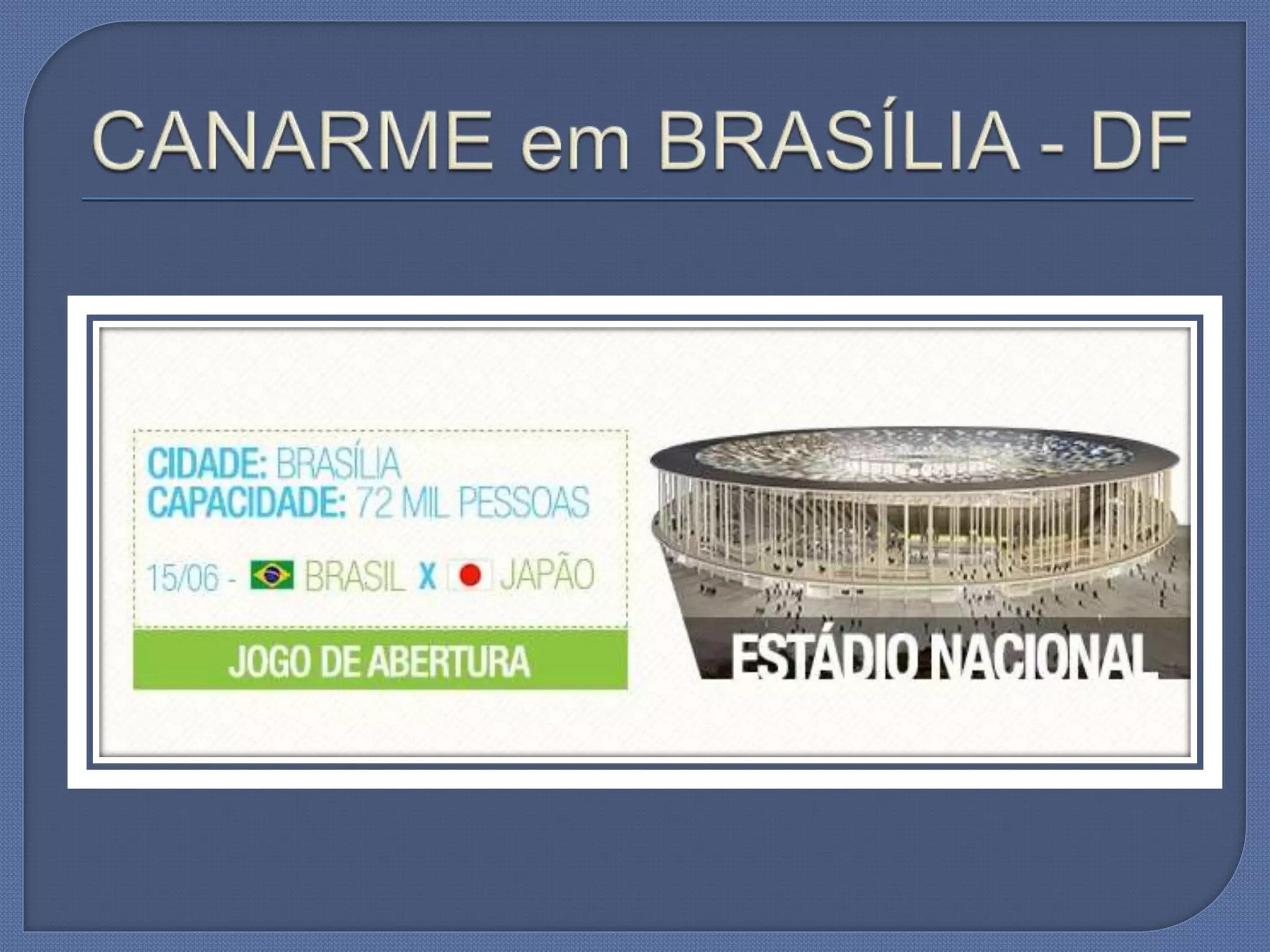 O documento aborda a capacitação e implantação de unidades da Canarme durante junho e julho de 2013. Menciona também eventos importantes como a Copa do Mundo de 2014, a Copa América de 2015 e as Olimpíadas de 2016. Contém informações de contato para Assunção Santos.