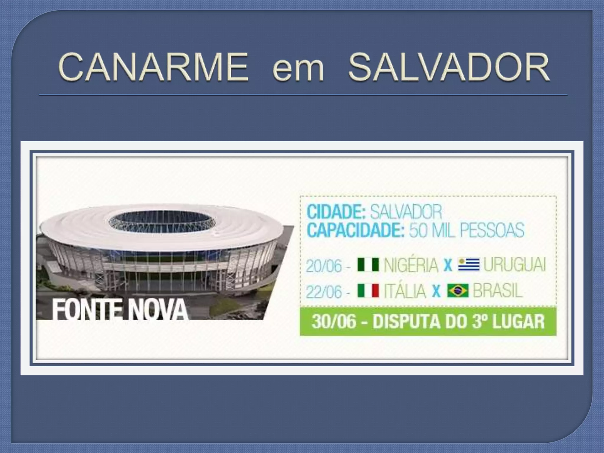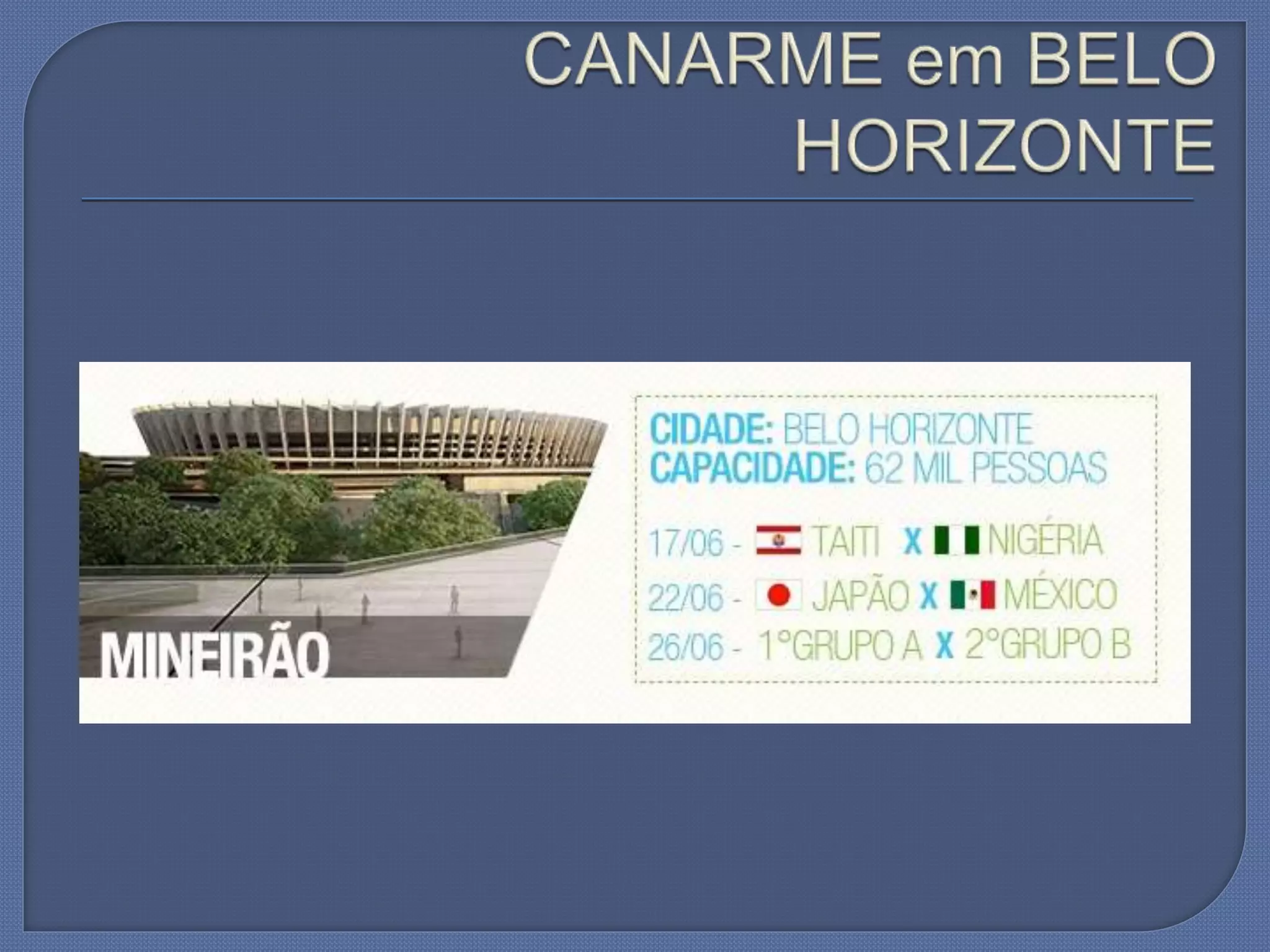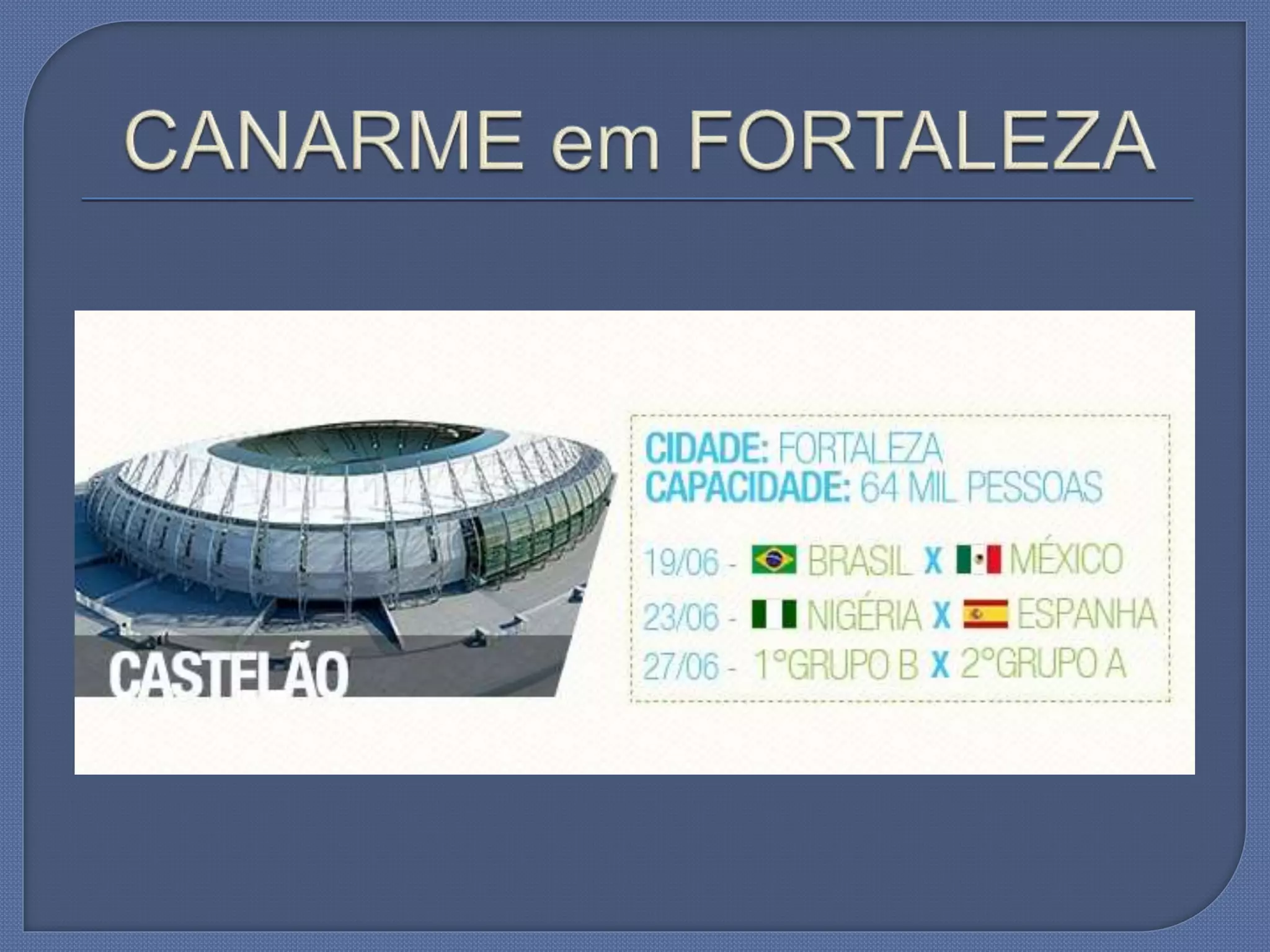 O documento aborda a capacitação e implantação de unidades da Canarme durante junho e julho de 2013. Menciona também eventos importantes como a Copa do Mundo de 2014, a Copa América de 2015 e as Olimpíadas de 2016. Contém informações de contato para Assunção Santos.