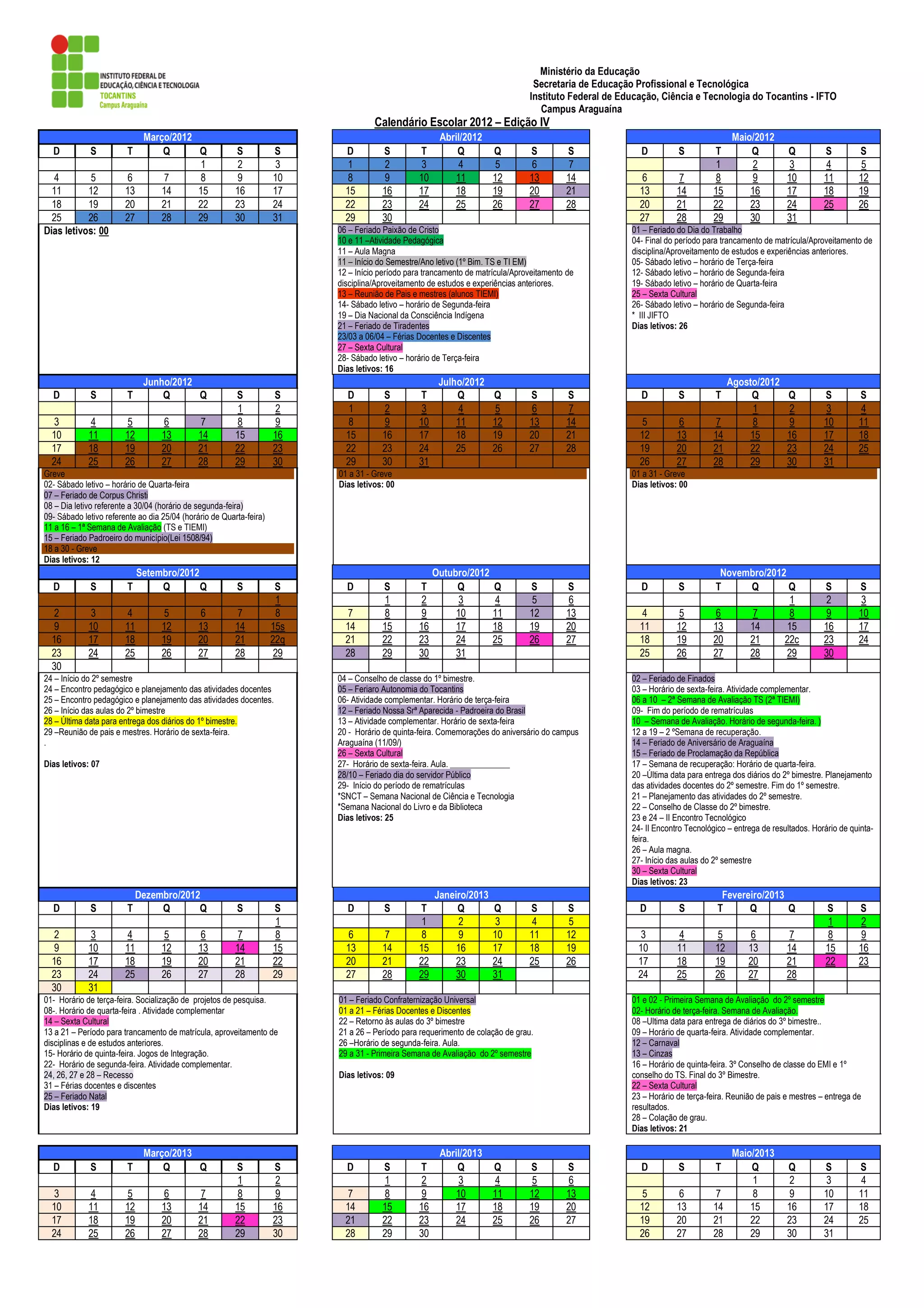 1) O documento apresenta o calendário escolar de 2012 de uma instituição federal de educação no Tocantins, com as datas letivas e não letivas marcadas mês a mês.