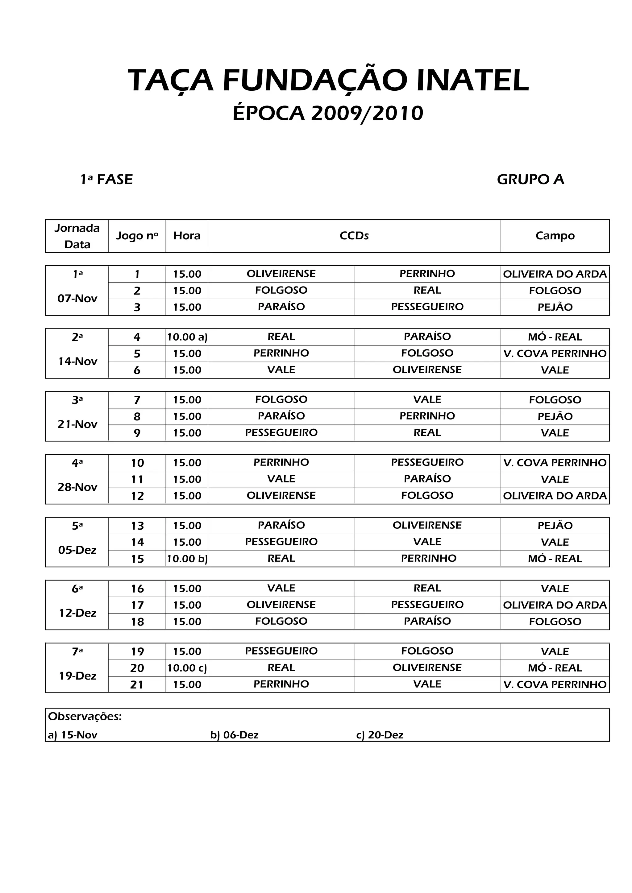 O documento lista os jogos da 1a fase da Taça Fundação Intal época 2009/2010 no Grupo A, com as datas, horários e locais dos 21 jogos entre as 7 equipas: Oliveirense, Folgoso, Paraíso, Pessegueiro, Real, Perrinho e Vale.