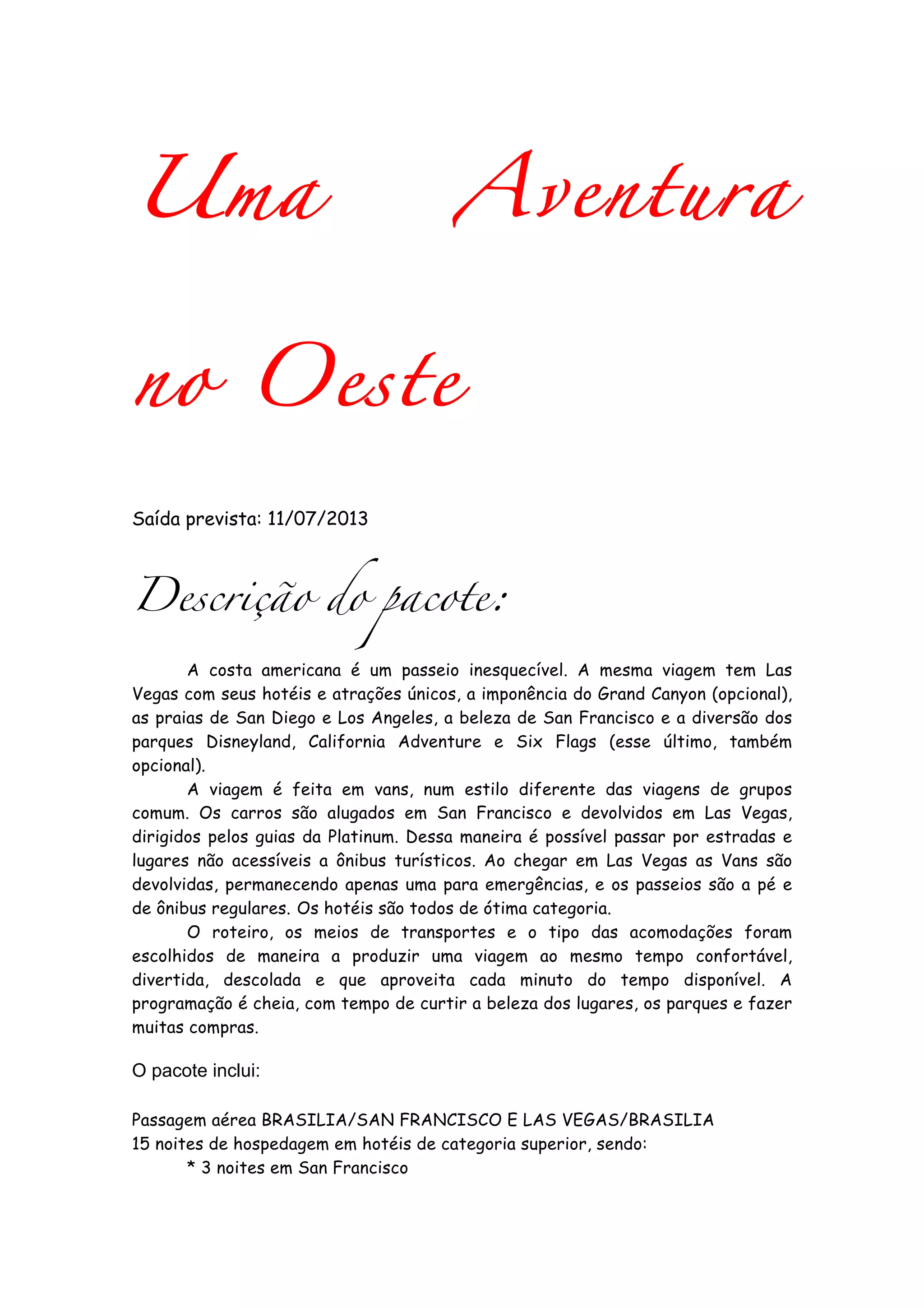Este documento descreve um pacote de viagem de 17 dias pela costa oeste dos Estados Unidos, incluindo passeios por São Francisco, Monterey, Los Angeles, San Diego e Las Vegas, com transporte em vans, hospedagem em hotéis de categoria superior e ingressos para parques temáticos e atrações. O roteiro oferece uma combinação de passeios, compras, lazer e entretenimento.