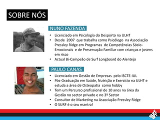 O documento descreve um projeto chamado Surf.Art criado por Nuno Fazenda e Paulo Canas para promover a resiliência de crianças e jovens em risco através da prática do surf. O projeto pretende testar durante 6 meses um protótipo com 12 crianças avaliando o impacto do surf no seu desenvolvimento pessoal.