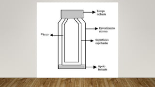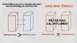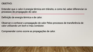 O documento explora o conceito de calor como energia térmica em trânsito e detalha os processos de transferência de calor: condução, convecção e irradiação. Discute a diferença entre condutores e isolantes térmicos, exemplificando com diversos materiais e suas aplicações práticas. Além disso, apresenta a importância do equilíbrio térmico e como a temperatura do corpo e do ambiente influencia a troca de calor.