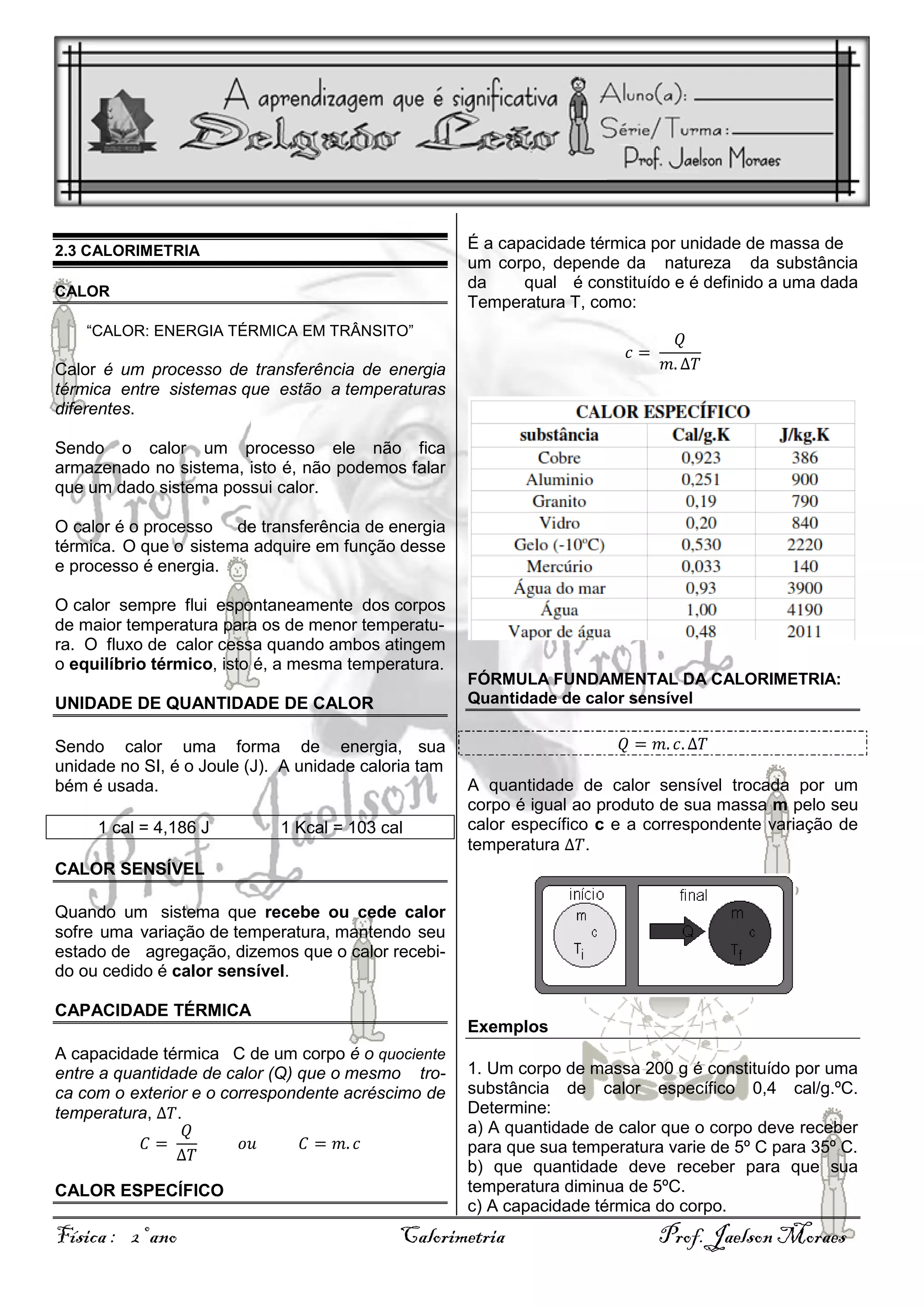 O documento descreve conceitos fundamentais de calor e calorimetria, incluindo: (1) calor é energia térmica em trânsito entre sistemas de diferentes temperaturas; (2) a unidade de quantidade de calor é o Joule; (3) a quantidade de calor sensível trocada por um corpo é igual ao produto de sua massa pelo calor específico e variação de temperatura.