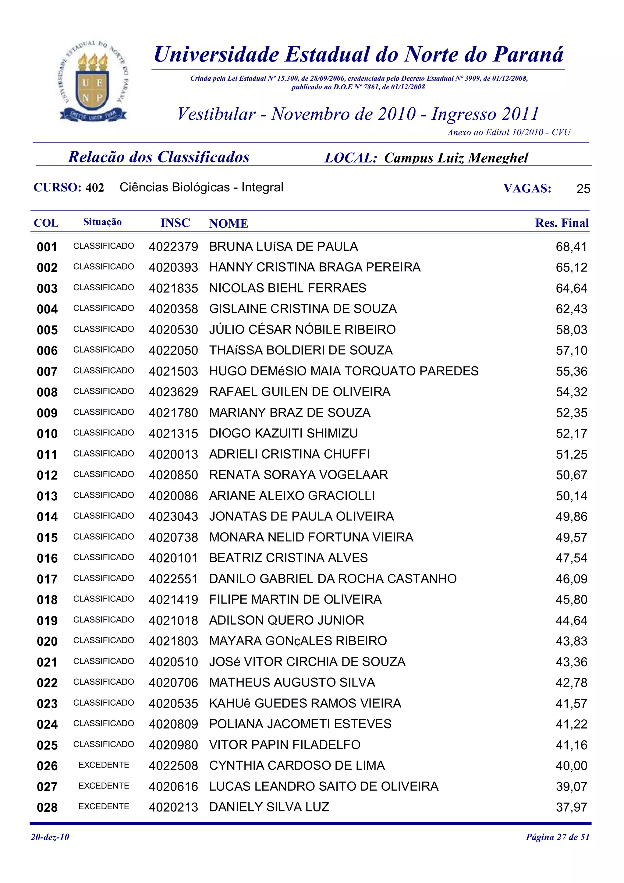 O documento lista os classificados e excedentes para o curso de Ciências Biológicas da Universidade Estadual do Norte do Paraná. Bruna Luísa de Paula ficou em primeiro lugar com 68,41 pontos e 38 candidatos foram classificados como excedentes.