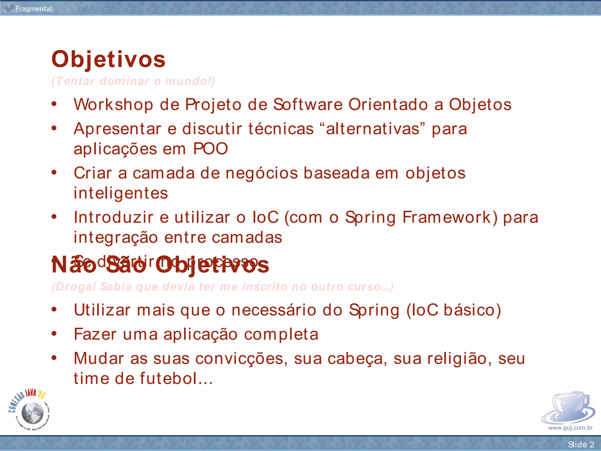 O documento apresenta um workshop sobre desenvolvimento orientado a objetos com Spring Framework. O objetivo é criar uma camada de negócios inteligente com objetos e introduzir o conceito de Inversion of Control (IoC) para integração entre camadas. A agenda inclui tópicos como modelagem de domínio, persistência de dados, introdução ao IoC e integração da primeira versão da aplicação.