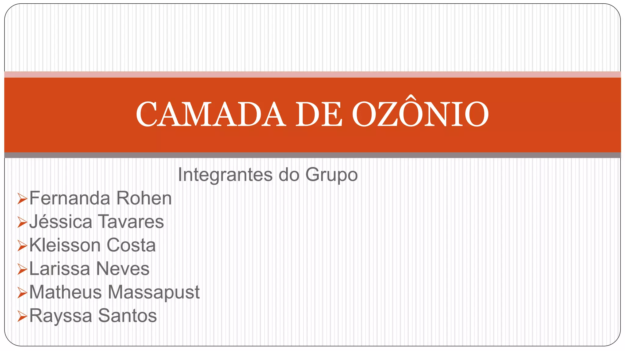 O documento apresenta os integrantes do grupo e fornece informações sobre a camada de ozônio, incluindo sua importância para a vida na Terra, as causas de sua destruição e os esforços internacionais para protegê-la através do Protocolo de Montreal.