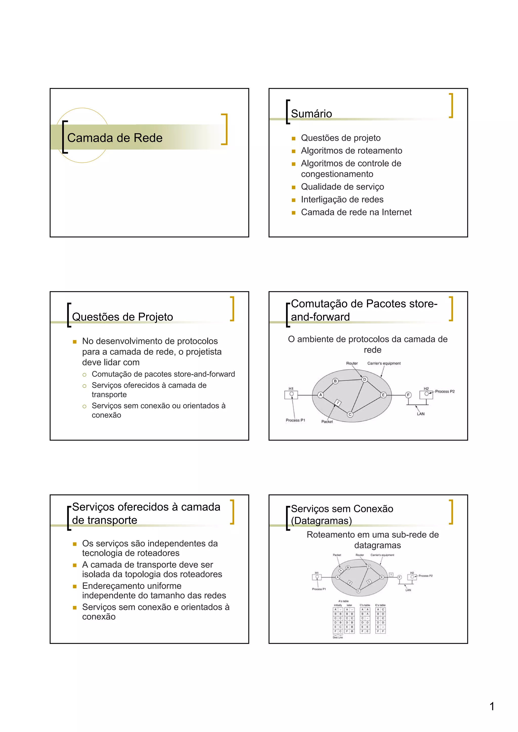 O documento discute vários tópicos relacionados à camada de rede, incluindo algoritmos de roteamento, controle de congestionamento e roteamento em redes ad hoc. Aborda algoritmos como Dijkstra e vetor de distância para roteamento, além de técnicas como roteamento por estado de enlace para controlar congestionamento. Também explica como o roteamento funciona em redes sem infraestrutura, como as redes ad hoc móveis.
