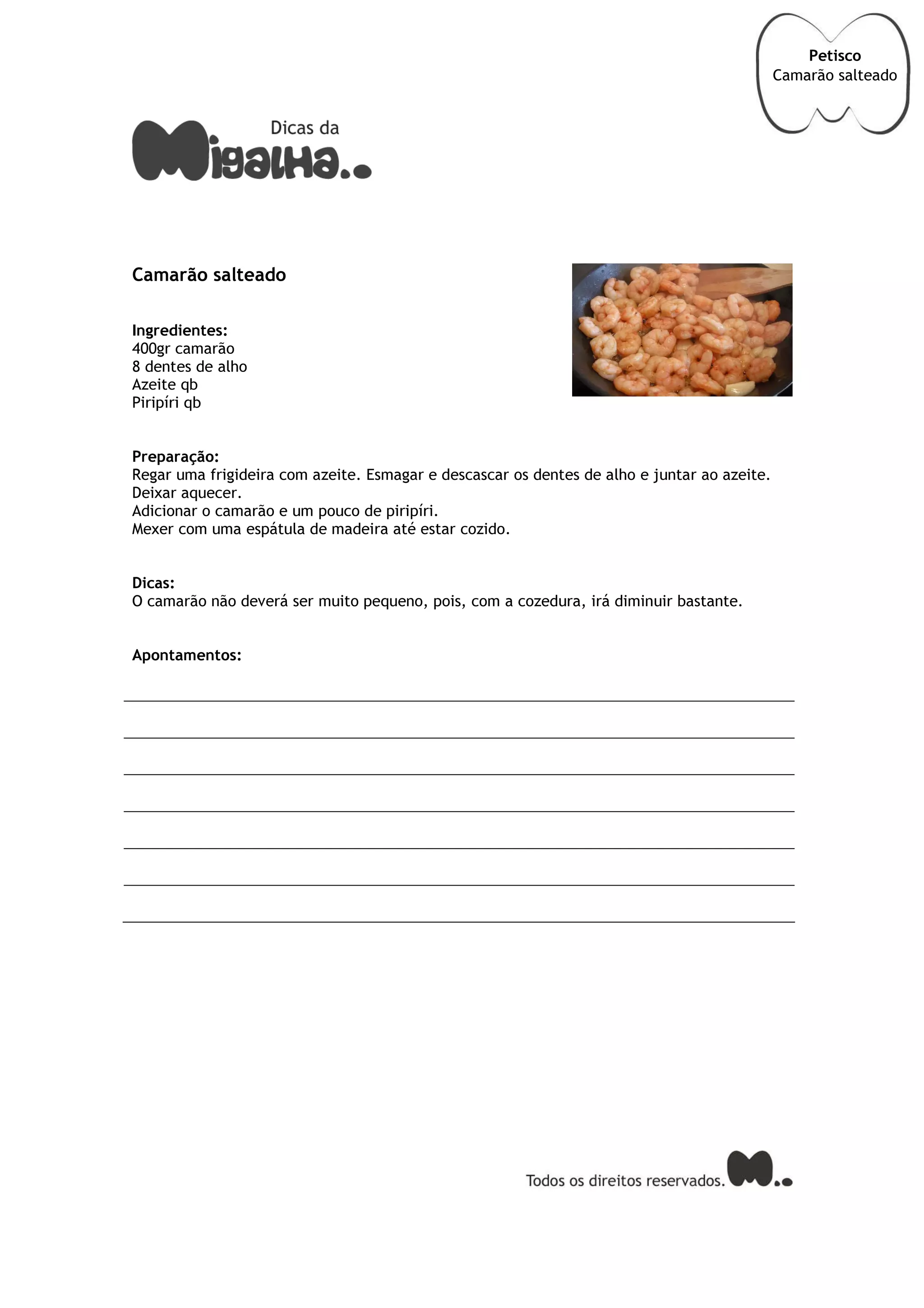 Este documento fornece uma receita simples para camarão salteado, incluindo ingredientes como camarão, alho, azeite e piripíri, e instruções para prepará-lo em uma frigideira aquecida com alho e azeite até que o camarão esteja cozido.