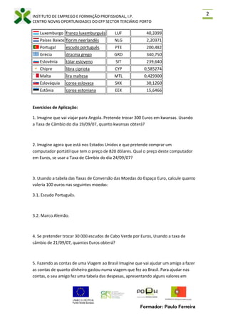 2) Inclui exemplos práticos de conversão de valores entre diferentes moedas usando as taxas de câmbio fornecidas.