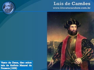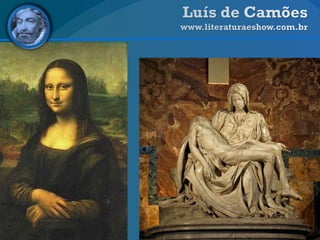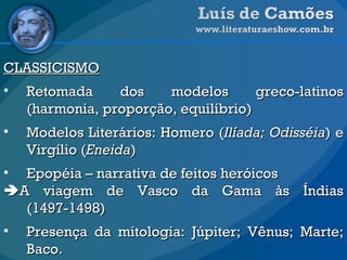O documento descreve a literatura portuguesa do período clássico e renascentista, incluindo a influência dos modelos greco-latinos, a chegada do dolce stil nuovo com Sá de Miranda, e a obra de Camões, notavelmente os Lusíadas, que concilia visões universal e pessoal.