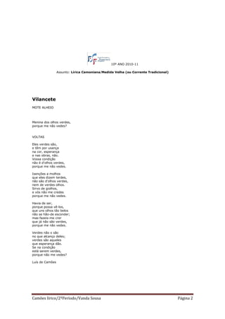 10º ANO 2010-11 Assunto: Lírica Camoniana/Medida Velha (ou Corrente Tradicional) Esparsa Ao desconcerto do Mundo Os bons vi sempre passar No Mundo graves tormentos; E pera mais me espantar, Os maus vi sempre nadar Em mar de contentamentos. Cuidando alcançar assim O bem tão mal ordenado, Fui mau, mas fui castigado. Assim que, só pera mim, Anda o Mundo concertado. Luís de Camões Vilancete Descalça vai para a fonte Lianor pela verdura; Vai fermosa, e não segura. Leva na cabeça o pote, O testo nas mãos de prata, Cinta de fina escarlata, Sainho de chamelote; Traz a vasquinha de cote, Mais branca que a neve pura. Vai fermosa e não segura. Descobre a touca a garganta, Cabelos de ouro entrançado Fita de cor de encarnado, Tão linda que o mundo espanta. Chove nela graça tanta, Que dá graça à fermosura. Vai fermosa e não segura. Luís de Camões Camões lírico/2ºPeríodo/Vanda Sousa Página 1