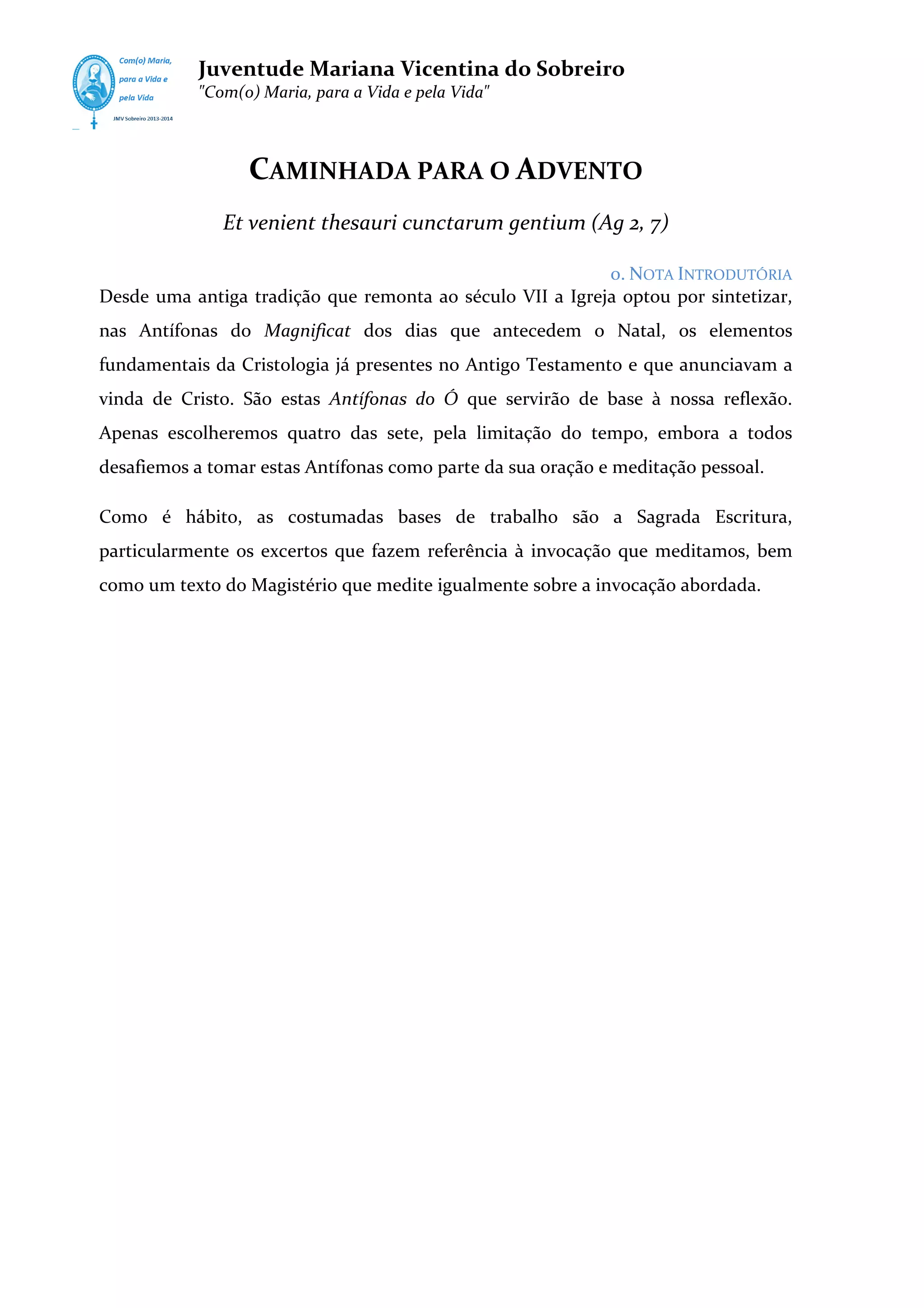 Este documento fornece instruções para uma caminhada espiritual durante o Advento baseada nas Antífonas do Magnificat. Apresenta quatro antífonas que serão meditadas ao longo das semanas, com passagens bíblicas e citações do Magistério que iluminam cada uma. O objetivo é preparar os corações para a vinda do Senhor através da oração e reflexão sobre os títulos messiânicos da Sabedoria, Raiz de Jessé, Chave de Davi e Rei das Nações.