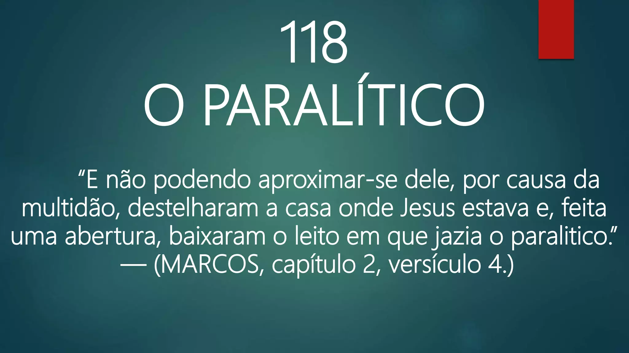 O documento relata a história bíblica de Jesus curando um paralítico. Os amigos do paralítico o carregam até Jesus, mas não conseguem chegar perto devido à multidão. Eles destelham o telhado e descem o paralítico através de uma abertura para que Jesus possa curá-lo.