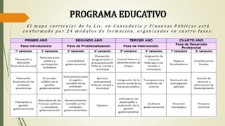 O programa educativo da Licenciatura em Contabilidade e Finanças Públicas é composto por 24 módulos organizados em quatro fases. O egresso terá competências como realizar funções contábeis, orçamentárias, fiscais, financeiras e de auditoria em entes públicos e propor investimentos estratégicas para gerar recursos.