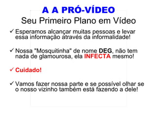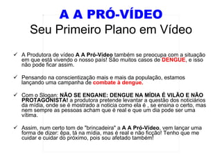 A produtora de vídeo A A Pró-Vídeo lançou uma campanha para conscientizar a população sobre os riscos da dengue, com o slogan "Dengue na Mídia é Vilão e não Protagonista". A campanha usa um tom informal para alertar que, apesar de a dengue aparecer frequentemente nas notícias, ela continua sendo uma ameaça real que requer cuidados para evitar a proliferação do mosquito transmissor.