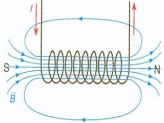 O documento explica que imãs criam campos magnéticos ao redor de si, assim como cargas elétricas criam campos elétricos. Ele representa o sentido do campo magnético usando uma bússola e mostra como gerar campos magnéticos uniformes com imãs, fios e solenóides.