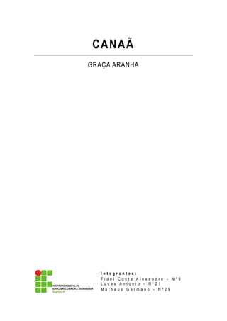 O documento analisa a obra 'Canaã' de Graça Aranha, destacando a biografia do autor e o estilo pré-modernista. A narrativa aborda a amizade entre Milkau e Lentz, que possuem ideologias opostas, e a vida trágica de Maria, que enfrenta adversidades e preconceitos. 'Canaã' serve como um marco do pré-modernismo, refletindo debates sobre nacionalidade e miscigenação.