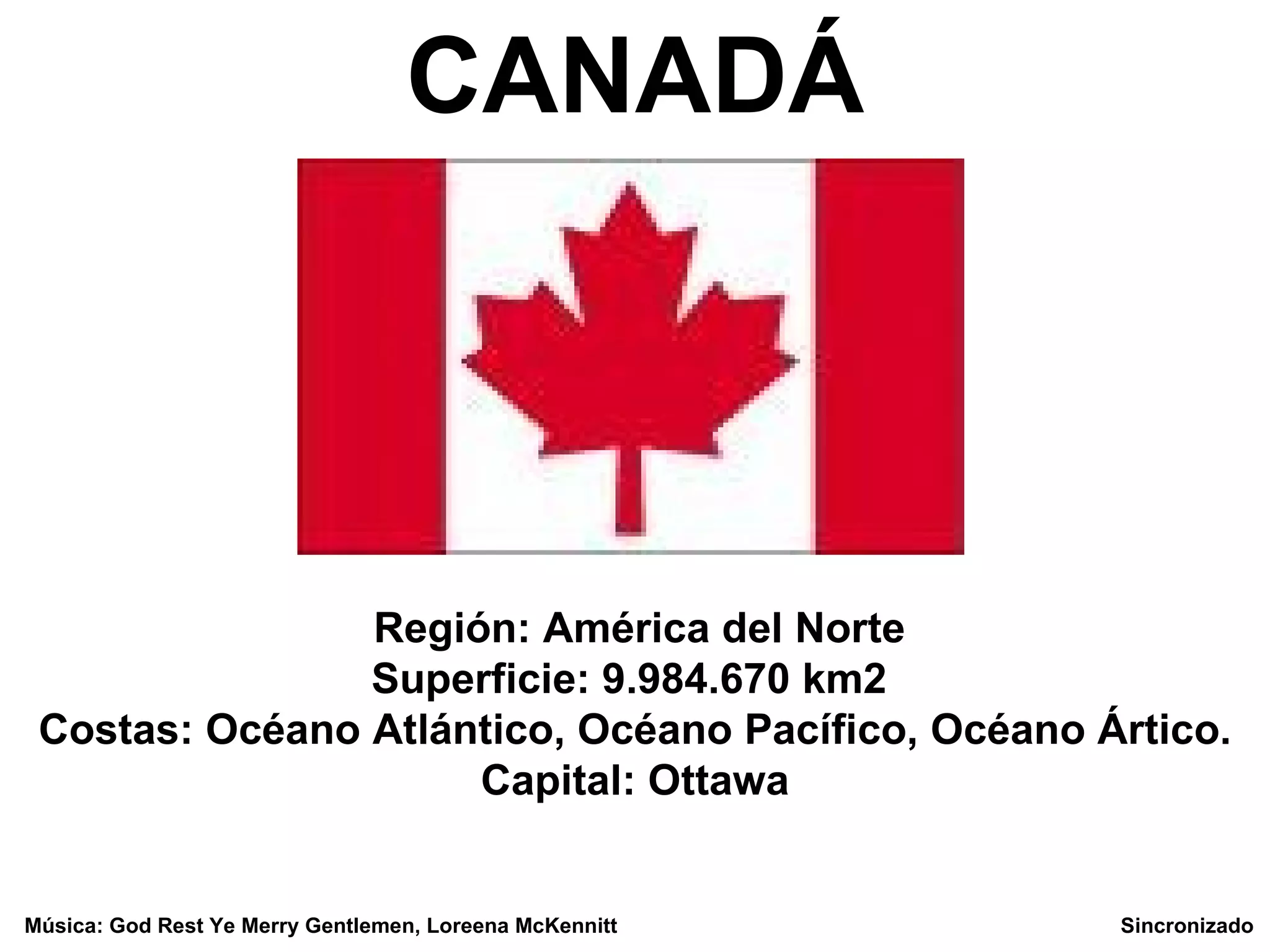 C ANADÁ Regi ó n: América del Norte Superficie : 9 . 984 . 670 km2 Cost as : Océano Atl á ntic o, Oc é an o Pac í fic o, Oc é an o Á rtic o. Capital: Ottawa M ú sic a : God Rest Ye Merry Gentlemen , Loreena McKennitt Sincronizado
