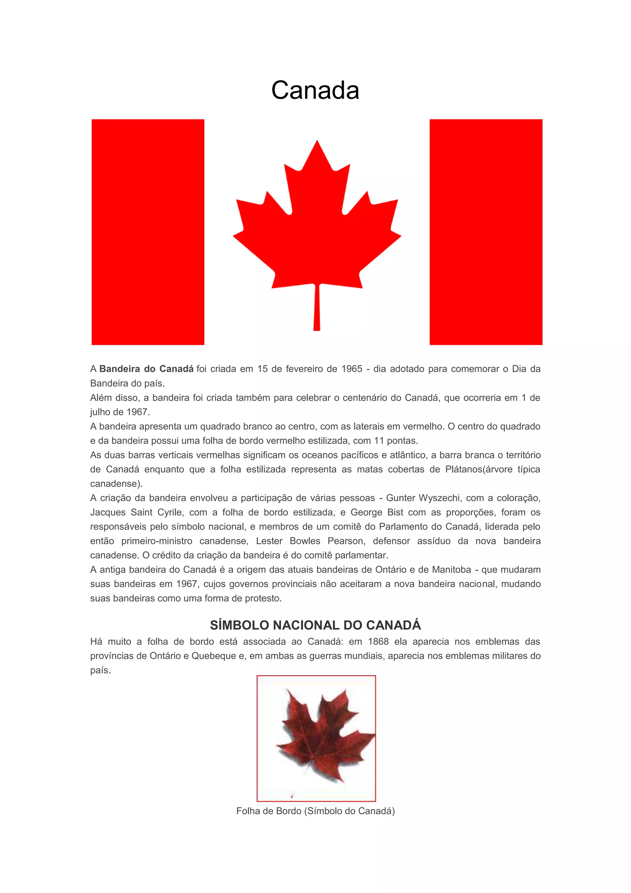 O documento descreve a bandeira do Canadá, que foi criada em 1965 para celebrar o centenário do país. A bandeira apresenta um quadrado branco central com laterais vermelhas e uma folha de bordo estilizada no centro, representando as matas canadenses. Sua criação envolveu várias pessoas e um comitê parlamentar liderado pelo primeiro-ministro da época.