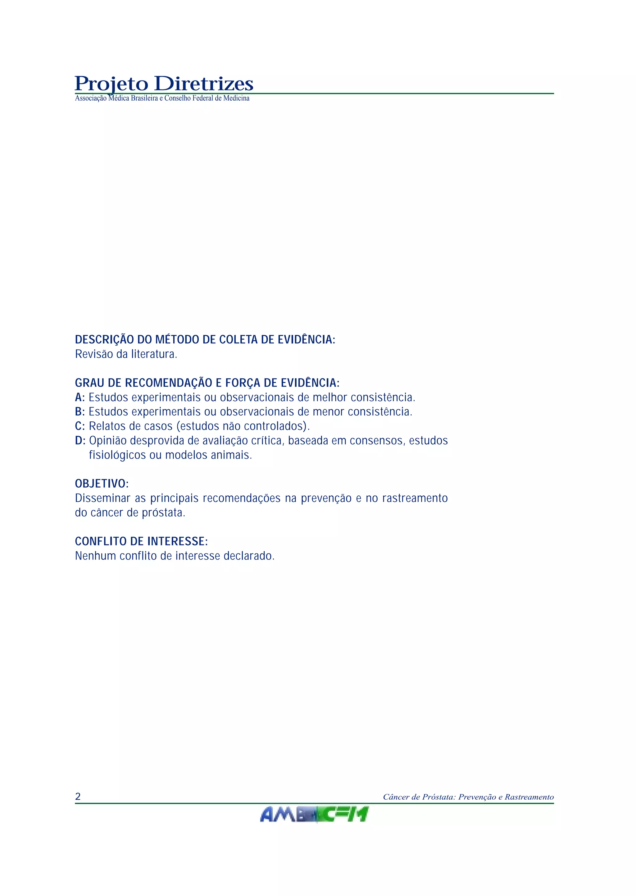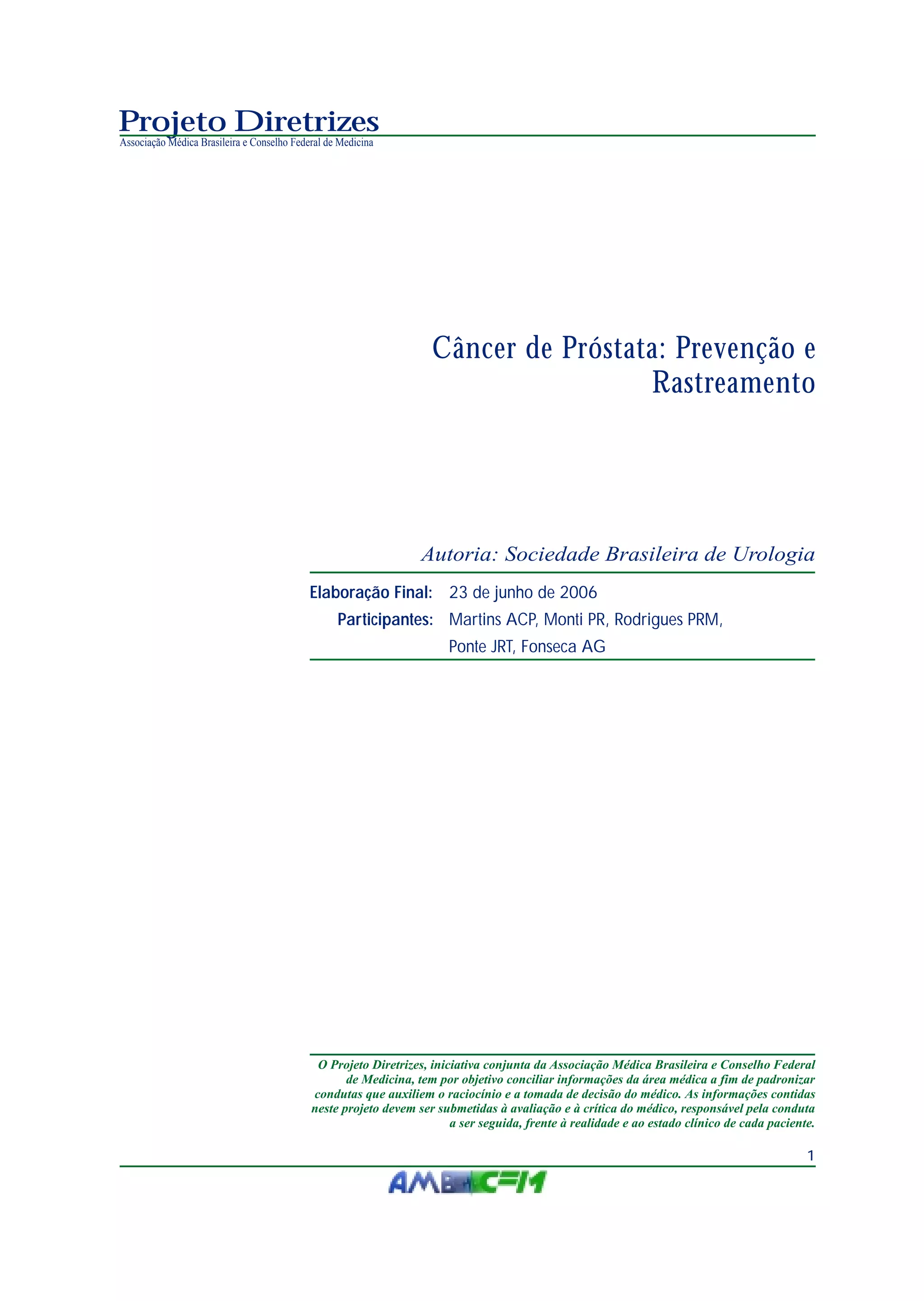 O documento discute as diretrizes do Projeto Diretrizes da Associação Médica Brasileira e Conselho Federal de Medicina sobre a prevenção e rastreamento do câncer de próstata. Ele fornece recomendações sobre fatores dietéticos, vitaminas e suplementos que podem reduzir o risco da doença, como consumo de peixe, vegetais, chá verde e derivados da soja. Também discute o uso potencial da finasterida para prevenção, embora seus efeitos precisam ser melhor avaliados.