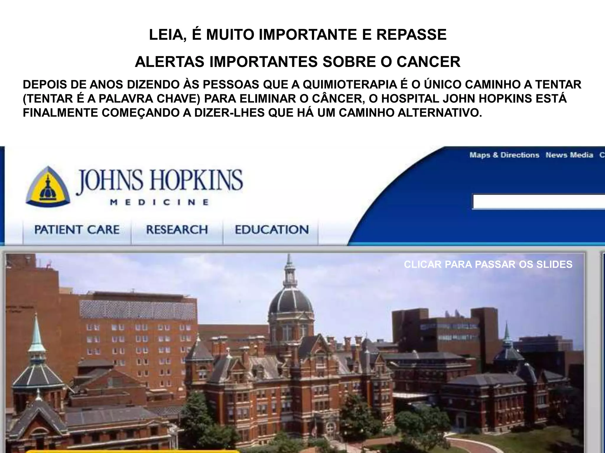1) O Hospital Johns Hopkins reconhece que existem alternativas à quimioterapia para tratar o câncer, como fortalecer o sistema imunológico através da dieta e suplementos.