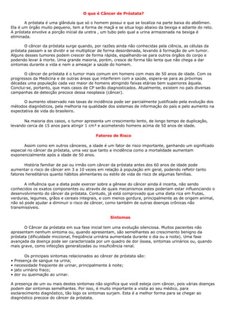 O documento resume o que é câncer de próstata, seus fatores de risco, sintomas, diagnóstico e tratamento. Explica que a próstata é uma glândula masculina e que o câncer ocorre quando células se multiplicam de forma desordenada, podendo se espalhar. A detecção precoce é importante, mas os métodos atuais como o exame de PSA não reduzem a mortalidade e levam a cirurgias desnecessárias.