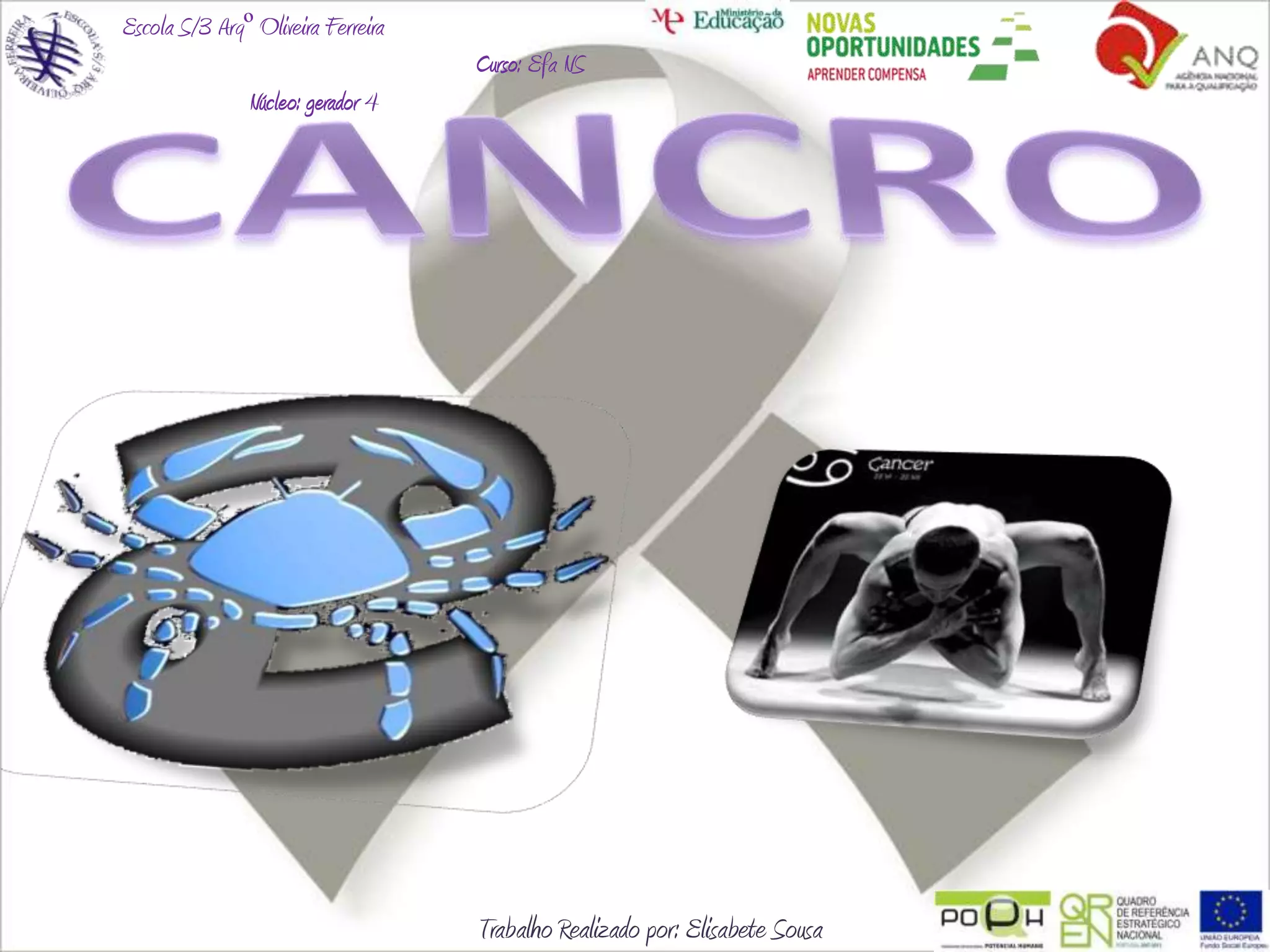 O documento discute o cancro, definindo-o como a proliferação anormal de células e explicando que pode afetar pessoas de todas as idades. Também aborda os tipos de tumores, fatores de risco, alimentação saudável para prevenção, e formas comuns de tratamento para cancros como da próstata e da mama.