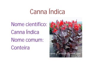 O documento descreve a planta Canna Índica, também conhecida como conteira. A planta pode crescer até 2 metros de altura com folhas de 30 a 60 centímetros de comprimento. Uma foto mostra folhas da planta ao lado de uma escola. A escola começou o ano com 7 plantas de Canna Índica e terminou o ano com as mesmas 7 plantas.