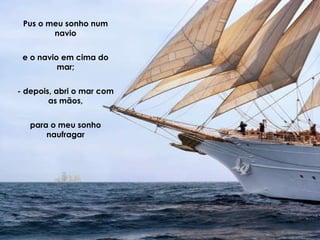 A poeta colocou seu sonho em um navio e o lançou ao mar, mas depois tentou afundar o navio abrindo as mãos no mar para que seu sonho naufragasse. Agora suas mãos estão molhadas da água do mar e a cor que escorre delas coloriu as areias desertas, enquanto o vento sopra e seu sonho morre dentro do navio afundando. Ela chorará até o mar crescer e afundar completamente o navio para que seu sonho desapareça.