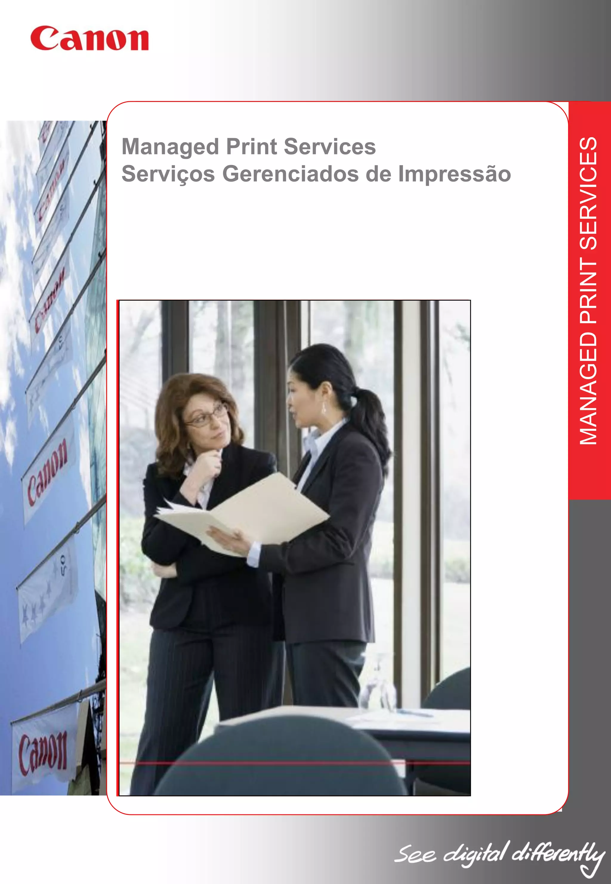O documento discute os benefícios dos Serviços Gerenciados de Impressão (Managed Print Services - MPS) oferecidos pela Canon. O MPS pode otimizar a infraestrutura de impressão das empresas, reduzindo custos de até 30% ao gerenciar ativos, tecnologia e processos de forma proativa. A Canon oferece uma variedade de serviços flexíveis de MPS, incluindo consultoria, gerenciamento de ativos, suporte ao usuário e serviços centralizados de impressão.