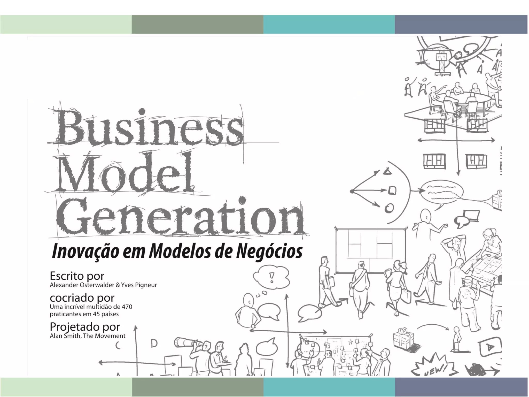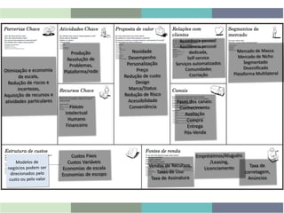 O documento descreve os nove blocos de construção de um Modelo de Negócios, incluindo Segmentos de Clientes, Proposta de Valor, Canais, Relacionamento com Clientes, Fontes de Receita, Recursos Principais, Atividades-Chave, Parcerias Principais e Estrutura de Custo.