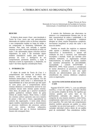 Este documento apresenta uma introdução à Teoria do Caos e sua aplicação às organizações. A Teoria do Caos estuda o comportamento de sistemas dinâmicos não-lineares e propõe que mudanças aparentemente insignificantes podem ter consequências imprevisíveis no longo prazo. O documento discute conceitos como sistemas de feedback, comportamento caótico e modelos matemáticos para analisar sistemas complexos como organizações.