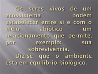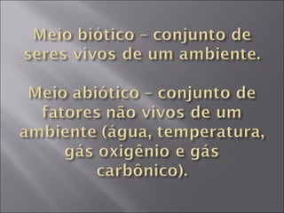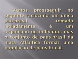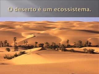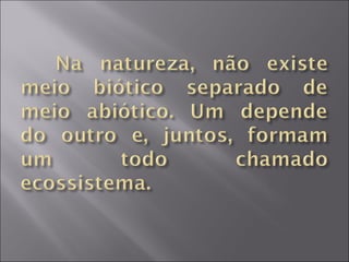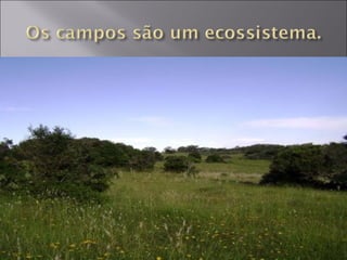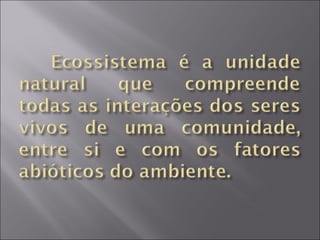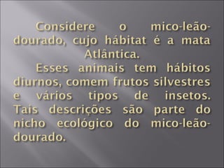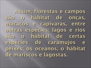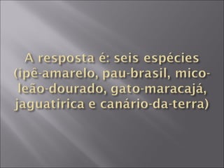 O documento discute ecossistemas brasileiros, mencionando a floresta amazônica e a Mata Atlântica como exemplos. Ele também lista espécies de plantas e animais encontrados nesses ecossistemas, como ipês-amarelos, micos-leões-dourados e jaguatiricas. Por fim, fornece instruções e recursos adicionais para os alunos.
