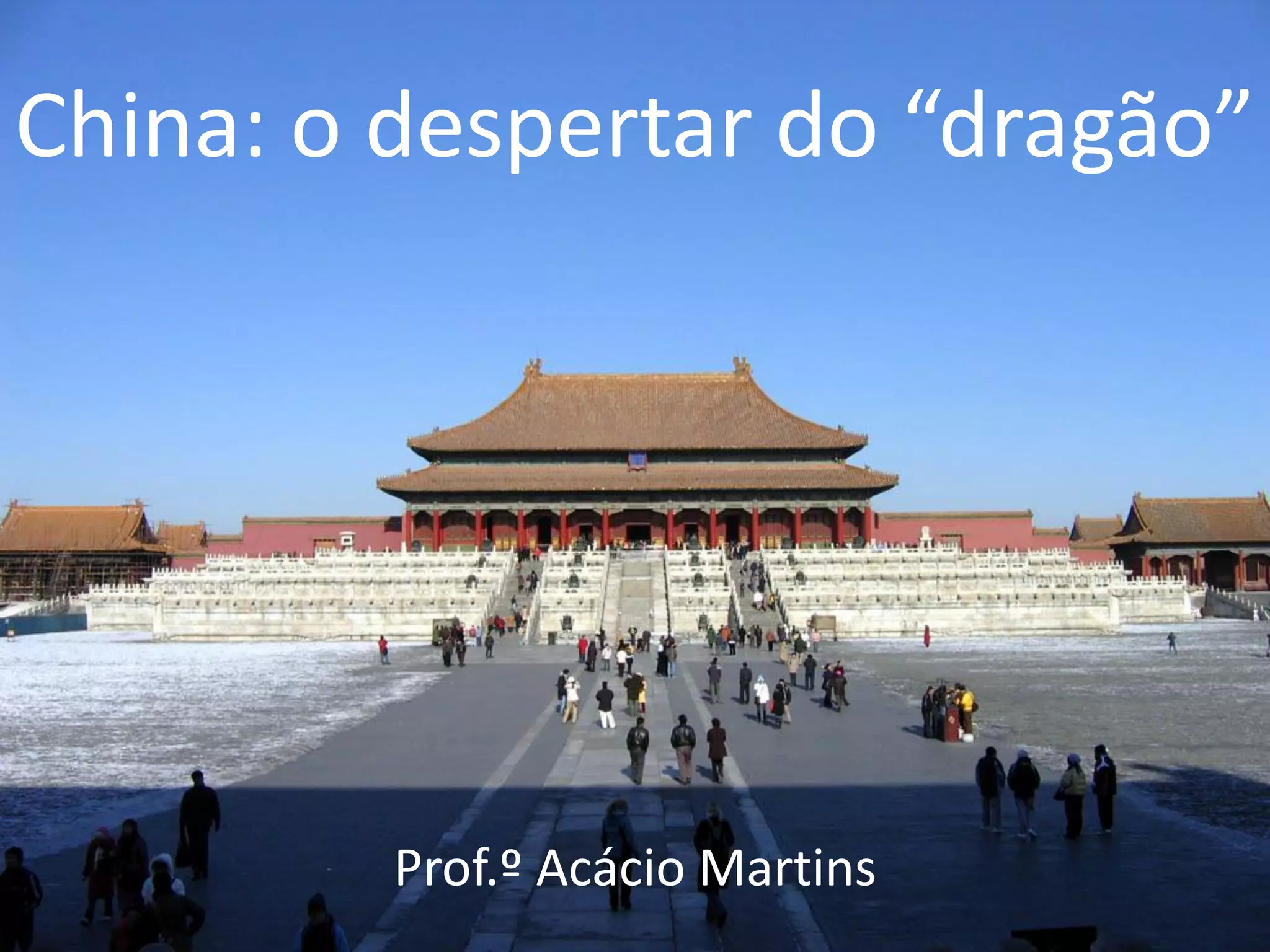 O documento descreve a geografia, história, economia e sociedade da China, começando com sua divisão em regiões oeste e leste. Detalha o período imperial, a revolução comunista de 1949 e o crescimento recente da China como potência econômica global.