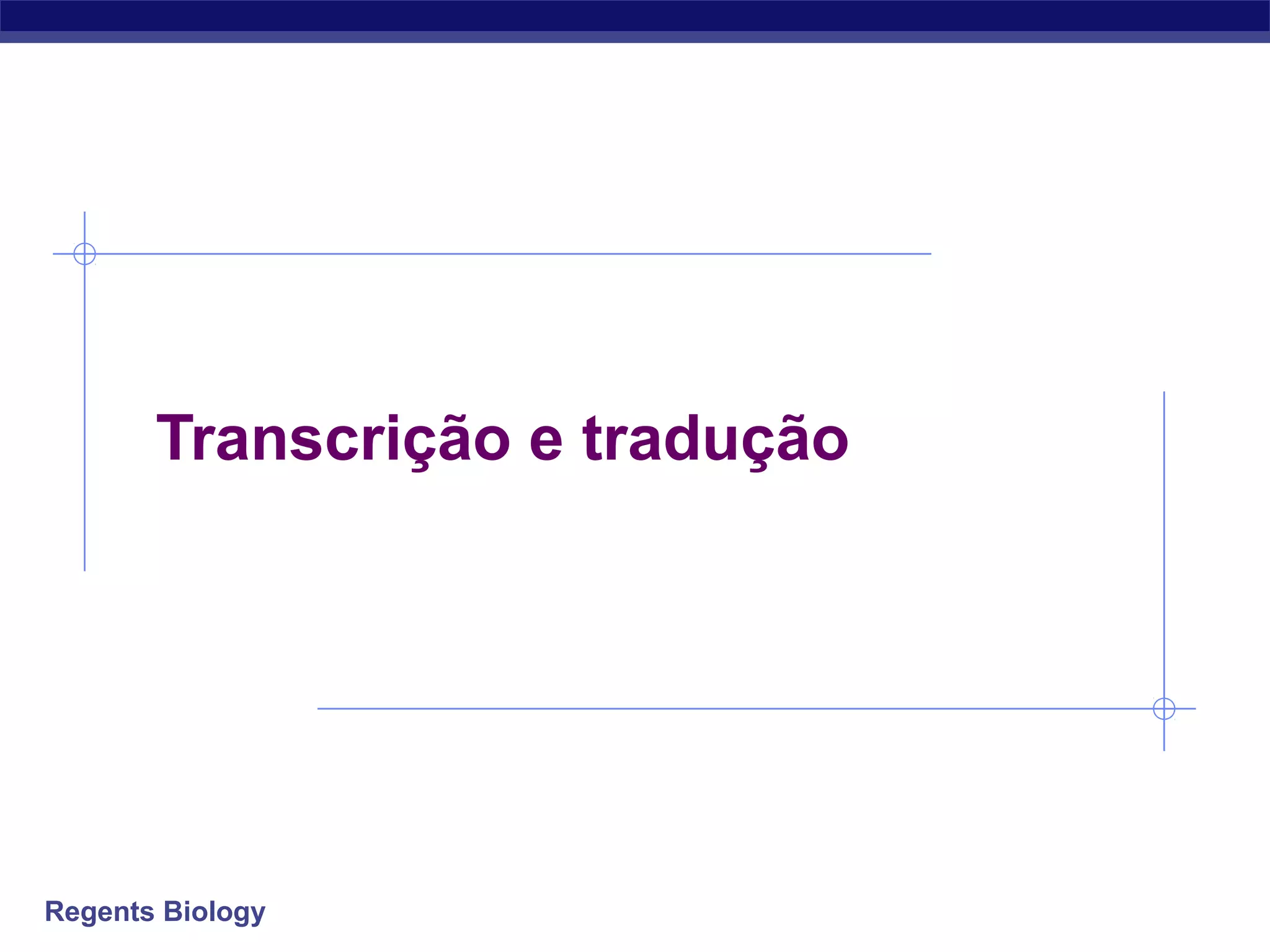 O documento discute o processo de síntese de proteínas, começando com a transcrição do DNA em RNA mensageiro no núcleo e a subsequente tradução do RNA mensageiro em proteínas no citoplasma pelos ribossomos. Explica como os códons no RNA mensageiro se emparelham com anticódons no RNA transportador para codificar aminoácidos específicos durante a tradução.