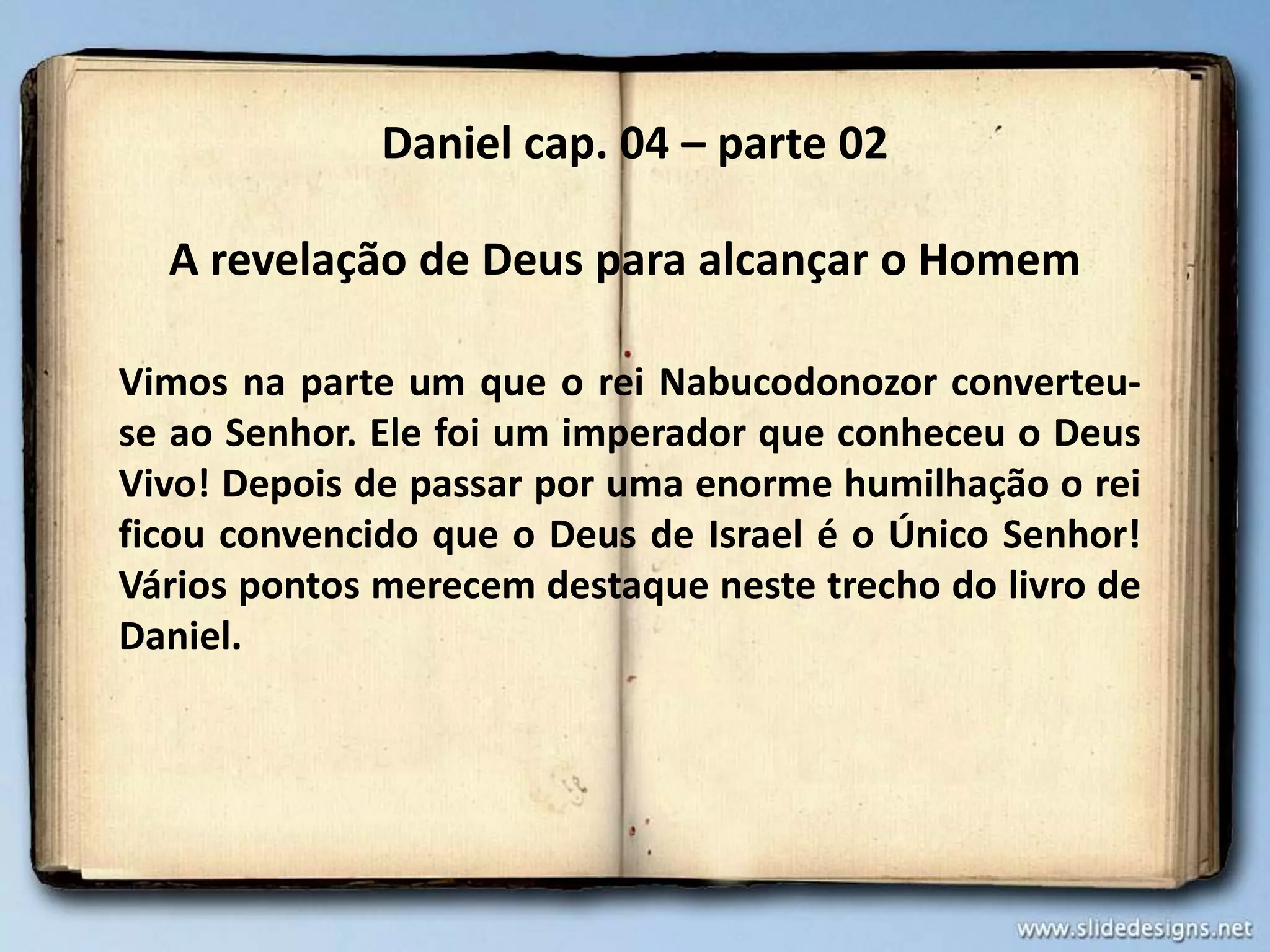 O documento descreve a conversão do rei Nabucodonozor após ser humilhado por Deus. Passou um ano sendo louco e vivendo como animal selvagem antes de reconhecer que Deus é o único Senhor. Também discute que Deus é paciente e dá muitas chances para arrependimento, mas que o juízo virá se não houver conversão.