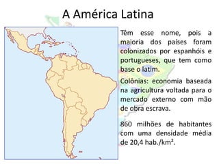 O documento resume as principais características geográficas, históricas, econômicas e políticas da América Latina. A região foi majoritariamente colonizada por espanhóis e portugueses, resultando em países com base no latim. A maioria possui economias baseadas em commodities e alta dependência externa, com desigualdades sociais significativas. Problemas como dívida externa, narcotráfico e influência geopolítica dos EUA também são destacados.